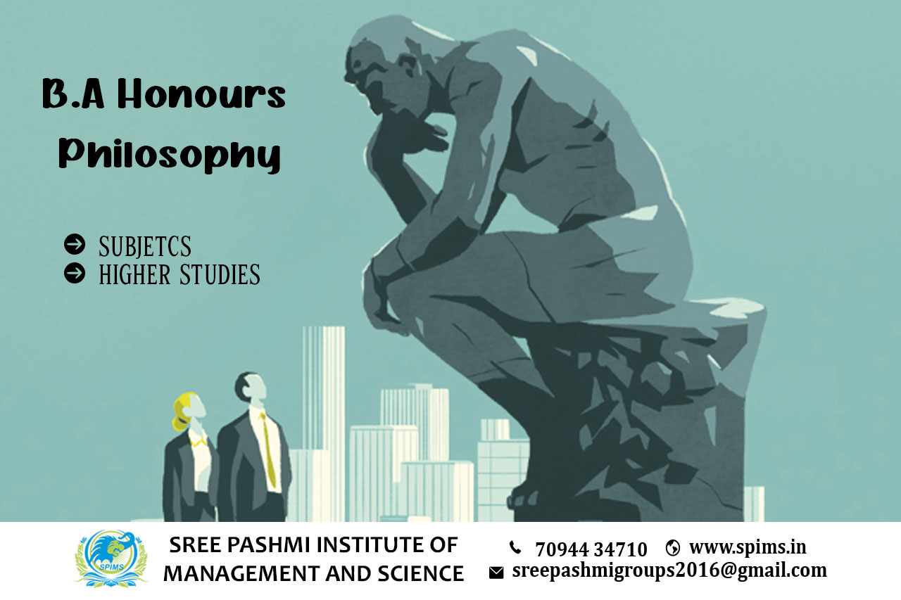 B.A Honours Philosophy / B.A Honours Philosophy course / B.A Honours Philosophy Degree/ B.A Honours Philosophy Eligibility/ Scope of B.A Honours Philosophy/ Salary of B.A Honours Philosophy / Importance of studying B.A Honours Philosophy / Subject involved in B.A Honours Philosophy course/ Benefits of taking B.A Honours Philosophy / B.A Honours Philosophy in Online Education/ Career opportunities for B.A Honours Philosophy graduate/B.A Honours Philosophy distance education/B.A Honours Philosophy in top University India/B.A Honours Philosophy in top University Tamilnadu / B.A Honours Philosophy in top University Coimbatore/B.A Honours Philosophy in online education.The B.A. Honours Philosophy is a degree program that focuses on the study of philosophical theories, concepts, and arguments. It is designed to develop students’ critical thinking skills and to help them gain a deeper understanding of philosophical ideas. subjects are typically covered in a B.A Honours Philosophy program may include: → Introduction to Philosophy → Epistemology → Metaphysics → Ethics → Logic and Critical Reasoning → Philosophy of Mind → Political Philosophy → Philosophy of Science → Eastern Philosophy → Philosophy of Language → Aesthetics After completing a B.A Honours Philosophy degree, students can pursue various higher study options, including: → Master's degree (M.A) in Philosophy → Master of Philosophy (M.Phil) in Philosophy → Doctor of Philosophy (Ph.D.) in Philosophy → Interdisciplinary Studies Sree Pashmi Institute of Management and Science is the leading distance education center in Coimbatore. Here you can find all UG, PG, Diploma, Certificate, and PG Diploma programs in the distance and online modes of education. Especially, when you join Sree Pashmi Institute of Management and Science, you can receive 7-value added courses such as the management field, such as HR, Technology Management, Entrepreneurship, Finance and Accounting, Digital marketing, Sales and Marketing, and Personal Branding for free.