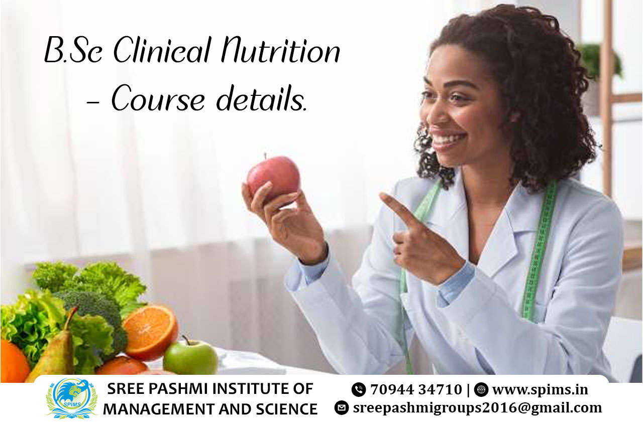 B.Sc Clinical Nutrition course / B.Sc Clinical Nutrition Degree/ B.Sc Clinical Nutrition course Eligibility/ Scope of B.Sc Clinical Nutrition course / Salary of B.Sc Clinical Nutrition course / Importance of studying B.Sc Hons Clinical Nutrition course/ Subject involved in B.Sc Clinical Nutrition course/ Benefits of taking B.Sc Clinical Nutrition course / B.Sc Clinical Nutrition course in Online Education/ Career opportunities for B.Sc Clinical Nutrition course graduate/ B.Sc Clinical Nutrition course distance education / B.Sc Clinical Nutrition course in top University India/ B.Sc Clinical Nutrition course in top University Tamilnadu / B.Sc Clinical Nutrition course in top University Coimbatore / B.Sc Clinical Nutrition course in online education in Coimbatore/ B.Sc Clinical Nutrition course in online education in Tamilnadu / B.Sc Clinical Nutrition course in online education in India / Online B.Sc Clinical Nutrition / Online B.Sc Clinical Nutrition degree B.Sc Clinical Nutrition is an undergraduate degree program designed to provide students with a comprehensive understanding of human nutrition and its application in the clinical setting. The course curriculum covers various aspects of nutrition science, including biochemistry, physiology, dietetics, and therapeutic nutrition. Students learn about the nutritional needs of individuals across different life stages and health conditions. Key topics in the B.Sc Clinical Nutrition program include the study of macronutrients (carbohydrates, proteins, and fats), micronutrients (vitamins and minerals), nutritional assessment, dietary planning, and the role of nutrition in preventing and managing diseases such as diabetes, obesity, and cardiovascular disorders. Students also gain knowledge about food safety, public health nutrition, and research methodologies related to nutrition. Practical training is a vital component of the course, involving hands-on experience in meal planning, food service management, and counseling patients on proper nutrition. Students often undergo internships in hospitals, clinics, and community settings to apply their knowledge in real-world scenarios.Upon completion of the B.Sc Clinical Nutrition program, graduates can pursue careers as clinical nutritionists, dietitians, health educators, and consultants in hospitals, healthcare organizations, research institutions, and the food industry. Additionally, they can work in public health programs, wellness centers, and fitness facilities, or opt for further studies such as master's degrees or specialized certifications to enhance their expertise in specific areas of nutrition and dietetics. Here at Sree Pashmi Institute of Management and Science, you can find all types of UG, PG, Diploma, PG Diploma, and certificate programs in the distance and online education modes. Enrolling in distance or online education courses via Sree Pashmi Institute of Management and Science, you can get UGC-approved degree certificates along with A+ grade mark sheets from your enrolled University. Also, we provide the students with exclusive online courses, live sessions, and other educational benefits.