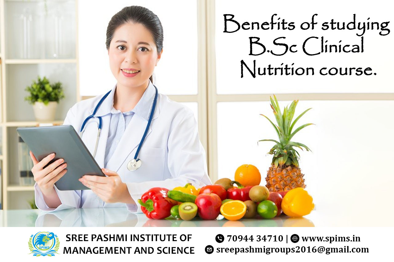B.Sc Clinical Nutrition course / B.Sc Clinical Nutrition Degree/ B.Sc Clinical Nutrition course Eligibility/ Scope of B.Sc Clinical Nutrition course / Salary of B.Sc Clinical Nutrition course / Importance of studying B.Sc Hons Clinical Nutrition course/ Subject involved in B.Sc Clinical Nutrition course/ Benefits of taking B.Sc Clinical Nutrition course / B.Sc Clinical Nutrition course in Online Education/ Career opportunities for B.Sc Clinical Nutrition course graduate/ B.Sc Clinical Nutrition course distance education / B.Sc Clinical Nutrition course in top University India/ B.Sc Clinical Nutrition course in top University Tamilnadu / B.Sc Clinical Nutrition course in top University Coimbatore / B.Sc Clinical Nutrition course in online education in Coimbatore/ B.Sc Clinical Nutrition course in online education in Tamilnadu / B.Sc Clinical Nutrition course in online education in India / Online B.Sc Clinical Nutrition / Online B.Sc Clinical Nutrition degree Studying B.Sc in Clinical Nutrition offers numerous benefits in the ever-expanding field of healthcare and nutrition. Firstly, it equips students with in-depth knowledge about the human body's nutritional requirements, enabling them to understand the critical role of nutrition in preventing and managing diseases. Graduates gain expertise in assessing patients' nutritional needs and developing personalized diet plans, crucial in combating the rise of lifestyle-related diseases like obesity, diabetes, and heart conditions. Furthermore, this course fosters strong analytical and research skills, allowing students to stay updated with the latest advancements in nutritional science. They learn to critically evaluate research studies and apply evidence-based practices, enhancing their decision-making abilities in real-world clinical scenarios.B.Sc in Clinical Nutrition also nurtures effective communication and counseling skills. Graduates can communicate complex nutritional information to patients, promoting healthier lifestyle choices. They often work closely with healthcare teams, including doctors and nurses, providing holistic patient care and contributing significantly to the healthcare system. Additionally, there's a growing demand for clinical nutritionists in hospitals, healthcare institutions, fitness centers, and research organizations. Graduates can pursue diverse career paths, including clinical dietetics, public health nutrition, sports nutrition, and food research and development.Ultimately, the B.Sc in Clinical Nutrition empowers individuals to make a positive impact on people's lives by promoting health and wellness, making it a rewarding and intellectually stimulating career choice. Sree Pashmi Institute of Management and Science is the leading distance education center in Coimbatore. Here you can find all UG, PG, Diploma, Certificate, and PG Diploma programs in the distance and online modes of education. Especially, when you join Sree Pashmi Institute of Management and Science, you can receive 7-value added courses such as the management field, such as HR, Technology Management, Entrepreneurship, Finance and Accounting, Digital marketing, Sales and Marketing, and Personal Branding for free.