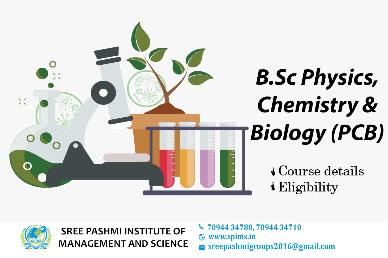 B.Sc Physics, Chemistry and Biology / B.Sc Physics, Chemistry and Biology What is it about/ Scope of B.Sc Physics, Chemistry and Biology / Salary of B.Sc Physics, Chemistry and Biology / Importance of studying B.Sc Physics, Chemistry and Biology/ B.Sc Physics, Chemistry and Biology distance education/ Benefits of taking B.Sc Physics, Chemistry and Biology / B.Sc Physics, Chemistry and Biology in distance education/ Eligibility for pursuing B.Sc Physics, Chemistry and Biology/ Career opportunities for B.Sc Physics, Chemistry, and Biology graduate/Subject involved in B.Sc Physics, Chemistry, and Biology course. B.Sc Physics, Chemistry, and Biology is a 3-year undergraduate course, which deals with the nuances of Physics and its various properties. The curriculum is divided into 6 semesters, spanning over three years. It includes the specialized scientific study of Physics, Mathematics, and Chemistry in detail. It focuses on organisms, biological systems, and the things driven by them. PCB is an abbreviation for Physics, Chemistry, and Biology. Candidates interested in PCB often have to pick between Mathematics and Biology. The Science stream is an enthralling and exciting option that opens up a world of possibilities for students to learn many elements of life's unknown features. The study includes the physical and living worlds and focuses on their intricacies and functioning. Students who wish to apply for admission to the B.Sc Physics, Chemistry, and Biology program must meet the following minimum eligibility requirements: It is required that the student complete Class 12 or any other comparable examination from a reputed board with a minimum of 50% marks. Aspirants must have completed Physics, Chemistry, and Biology as required courses in Grade 12. The students should have passed their PUC or Class 12th in the science stream with 50% aggregate for the general category and 45% aggregate for OBC/SC/ST category from recognized boards. Here at Sree Pashmi Institute of Management and Science, you can find all types of UG, PG, Diploma, PG Diploma, and certificate programs in the distance and online education modes. Enrolling in distance or online education courses via Sree Pashmi Institute of Management and Science, you can get UGC-approved degree certificates along with A+ grade mark sheets from your enrolled University. Also, we provide the students with exclusive online courses, live sessions, and other educational benefits.
