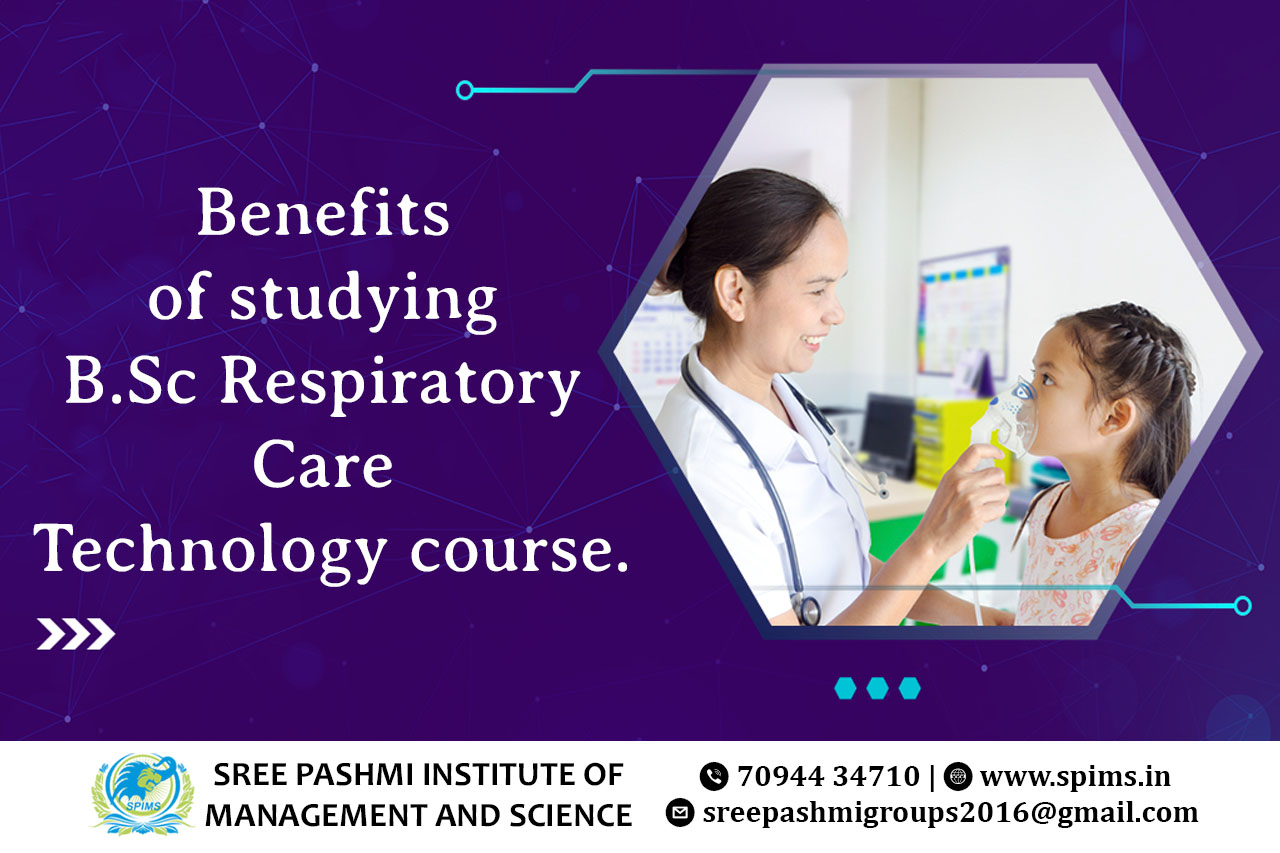 B.Sc Respiratory Care Technology course / B.Sc Respiratory Care Technology Degree/ B.Sc Respiratory Care Technology course Eligibility/ Scope of B.Sc Respiratory Care Technology course / Salary of B.Sc Respiratory Care Technology course / Importance of studying B.Sc Respiratory Care Technology course/ Subject involved in B.Sc Respiratory Care Technology course/ Benefits of taking B.Sc Respiratory Care Technology course / B.Sc Respiratory Care Technology course in Online Education/ Career opportunities for B.Sc Respiratory Care Technology course graduate/ B.Sc Respiratory Care Technology course distance education / B.Sc Respiratory Care Technology course in top University India/ B.Sc Respiratory Care Technology course in top University Tamilnadu / B.Sc Respiratory Care Technology course in top University Coimbatore / B.Sc Respiratory Care Technology course in online education in Coimbatore/ B.Sc Respiratory Care Technology course in online education in Tamilnadu / B.Sc Respiratory Care Technology course in online education in India / Online B.Sc Respiratory Care Technology / Online B.Sc Respiratory Care Technology degree. Studying B.Sc Respiratory Care Technology offers several benefits, providing a unique blend of theoretical knowledge and practical skills focused on respiratory health. Here are some key advantages of pursuing this course: Respiratory care technologists play a crucial role in diagnosing, treating, and managing patients with respiratory issues, making their work vital in healthcare settings. With the increasing prevalence of respiratory diseases like asthma, COPD, and COVID-19, there is a growing demand for skilled respiratory care professionals globally. Graduates can work in various healthcare settings, including hospitals, clinics, home healthcare, and research institutions. They can also specialize in areas like critical care, pulmonary diagnostics, or sleep medicine. Respiratory care technologists directly impact patients' lives by helping them breathe better. Their interventions can significantly improve the quality of life for individuals with respiratory disorders. Students gain expertise in using advanced respiratory therapy equipment and technologies, enhancing their technical skills and making them valuable assets in healthcare teams. Respiratory care technologists work closely with physicians, nurses, and other healthcare professionals, fostering a collaborative and dynamic work environment. The field of respiratory care is continually evolving with new research, therapies, and technologies. Graduates have opportunities for continuous learning and specialization. Respiratory care professionals are in demand worldwide. Graduates can explore job opportunities internationally, making it a globally relevant qualification. Due to the critical nature of their work, respiratory care technologists enjoy job security and stability in the healthcare industry. By promoting respiratory health and educating patients about preventive measures, respiratory care technologists contribute significantly to public health initiatives. The profession offers personal satisfaction as professionals directly witness the positive impact of their interventions on patients' well-being. Studying B.Sc Respiratory Care Technology not only opens the door to a rewarding and fulfilling career but also allows individuals to make a meaningful difference in the lives of patients suffering from respiratory ailments. Here at Sree Pashmi Institute of Management and Science, you can find all types of UG, PG, Diploma, PG Diploma, and certificate programs in the distance and online education modes. Enrolling in distance or online education courses via Sree Pashmi Institute of Management and Science, you can get UGC-approved degree certificates along with A+ grade mark sheets from your enrolled University. Also, we provide the students with exclusive online courses, live sessions, and other educational benefits.