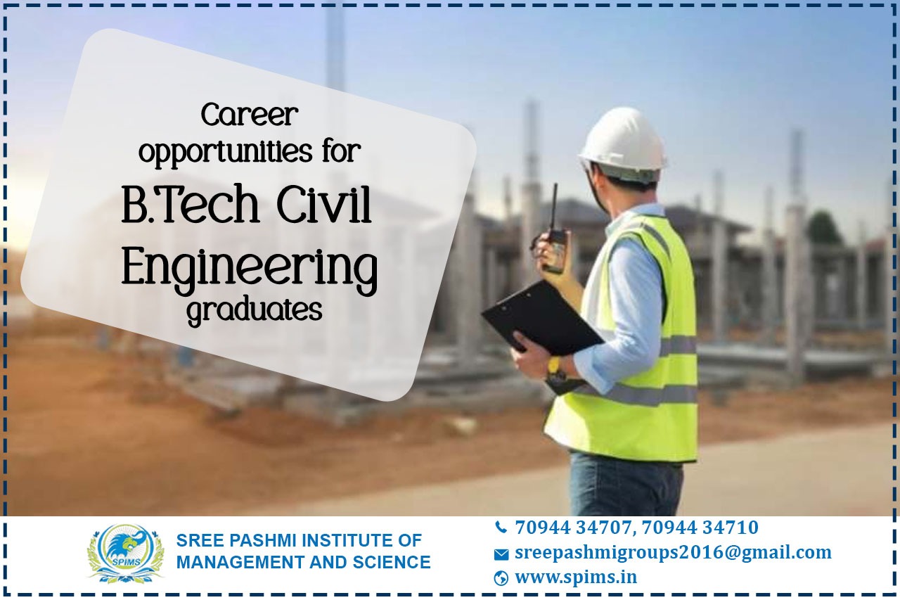 B.Tech Civil Engineering/ B.Tech Civil Engineering What is it about/ Scope of B.Tech Civil Engineering/ Salary of B.Tech Civil Engineering / Importance of studying B.Tech Civil Engineering/ Benefits of taking B.Tech Civil Engineering / Eligibility for pursuing B.Tech Civil Engineering / Career opportunities for B.Tech Civil Engineering/B.Tech Civil Engineering course details. The job scope of B.Tech in Civil Engineering graduates is wide and varied in both government and private sectors. As for the B.Tech Civil Engineering job vacancy, there is a great demand for skilled civil engineers due to real estate growth. Besides the construction industry, the water system and transport systems require constant maintenance and improvements. So, there will always be a need for qualified and skilled engineers. After completing B.Tech in Civil Engineering, the graduates can get placed in public or private sector companies and work as field civil engineers and other similar designations. B.Tech Civil Engineering jobs for freshers after completion of B.Tech Civil Engineering: → Civil Site Engineer → Structural Engineer → Design Engineer → Document Controller → Junior Civil Engineer Job designation for civil engineers with experience: → Senior Project Engineer → Project Manager → Senior Software Engineer → Assistant Professor → Project Associate Civil engineers with 1- 4 years of experience earn an average total INR 2.9 LPA salary. The salary of B.Tech Civil Engineers in mid-career with 5-9 years of experience is INR 4.6 LPA. In comparison, the average package for experienced civil engineers with 10 - 19 years of experience is INR 6.4 LPA. Sree Pashmi Institute of Management and Science is the leading distance education center in Coimbatore. Here you can find all UG, PG, Diploma, Certificate, and PG Diploma programs in the distance and online modes of education. Especially, when you join Sree Pashmi Institute of Management and Science, you can receive 7-value added courses in the management field, such as HR, Technology Management, Entrepreneurship, Finance and accounting, Digital marketing, Sales and Marketing, and Personal Branding for free.