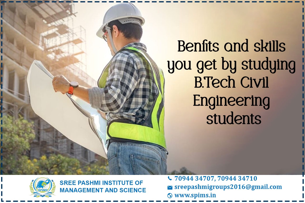 B.Tech Civil Engineering/ B.Tech Civil Engineering What is it about/ Scope of B.Tech Civil Engineering/ Salary of B.Tech Civil Engineering / Importance of studying B.Tech Civil Engineering/ Benefits of taking B.Tech Civil Engineering / Eligibility for pursuing B.Tech Civil Engineering / Career opportunities for B.Tech Civil Engineering/B.Tech Civil Engineering course details. Bachelor of Technology in Civil Engineering is an undergraduate Civil Engineering course. Civil engineering is a professional engineering discipline that deals with the design, construction, and maintenance of the physical and naturally built environment, including works like bridges, roads, canals, dams, and buildings. Civil engineering is the oldest engineering discipline after military engineering, and it was defined to distinguish non-military engineering from military engineering. The duration of the course is four years, and it may be offered by some institutes more or fewer times as per their rules and regulations.B.Tech Civil Engineering graduates can pursue both long-term and short-term courses. Some of them are listed below: → M.Tech Civil Engineering → M.Tech Transportation Engineering → M.Tech Environmental Engineering → M.Tech Earthquake Engineering → M.Tech Construction Engineering Alternatively, B.Tech Civil Engineering graduates can opt for Management programs such as: → MBA in Project Management → MBA in Construction Management → MBA in Infrastructure Management Are you still waiting to start your distance learning? Sree Pashmi Institute of Management and Science in Coimbatore is the best choice for your higher education. Here you can get amazing distance education programs from well-reputed universities in and around India. Moreover, you can get full coordination from the start to the end of your course. So don’t wait to enroll in a distance education course at Sree Pashmi Institute of Management and Science and gain the benefits of quality education.