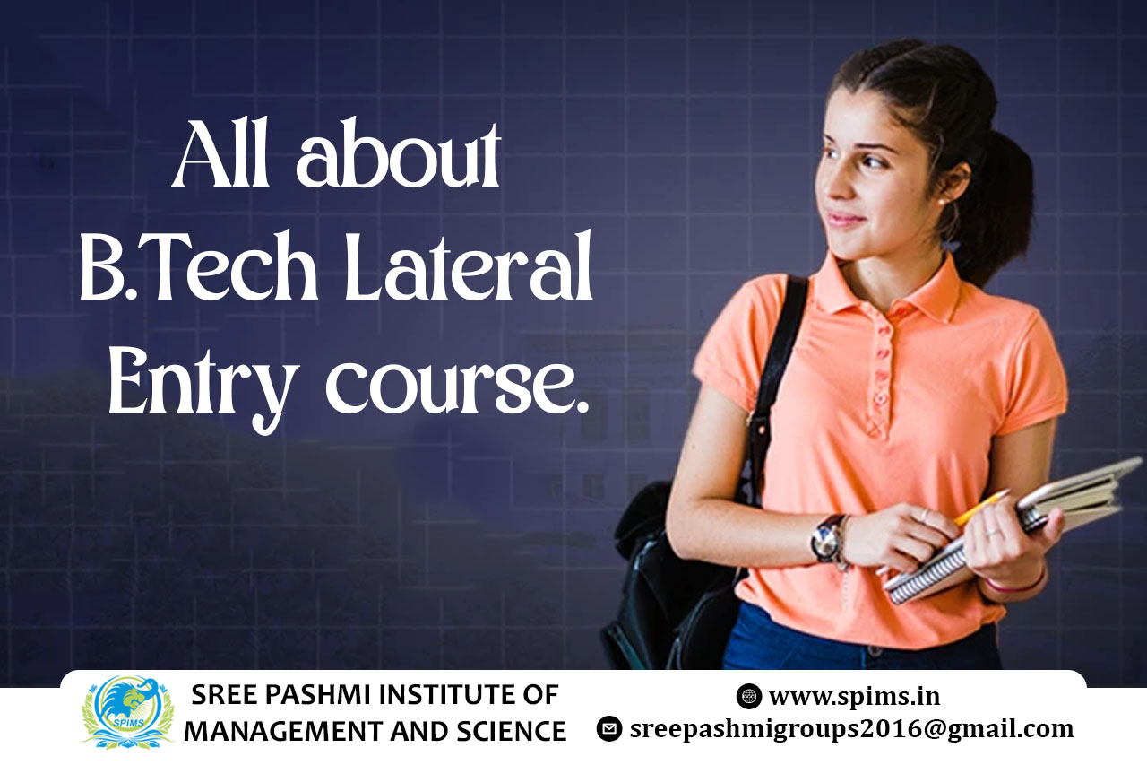 B.Tech Lateral Entry / B.Tech Lateral Entry course / B.Tech Lateral Entry Degree/ B.Tech Lateral Entry Eligibility/ Scope of B.Tech Lateral Entry/ Salary of B.Tech Lateral Entry/ Importance of studying B.Tech Lateral Entry/ Subject involved in B.Tech Lateral Entry course/ Benefits of taking B.Tech Lateral Entry/ B.Tech Lateral Entry in Online Education/ Career opportunities for B.Tech Lateral Entry graduate/B.Tech Lateral Entry in distance education / B.Tech Lateral Entry in top University India/B.Tech Lateral Entry Tamilnadu / B.Tech Lateral Entry in top University Coimbatore/ B.Tech Lateral Entry in online education in Coimbatore/ Higher studies after B.Tech Lateral Entry course/B.Tech Lateral Entry in online education in Tamilnadu / B.Tech Lateral Entry in online education in India/ Advantages of B.Tech Lateral Entry/ Significance of B.Tech Lateral Entry. B.Tech Lateral Entry is a program specifically designed for diploma holders, offering them a faster track to earning a full-fledged B.Tech degree. Subjects covered: Core: Math, Physics, Chemistry, along with engineering fundamentals like Mechanics, Thermodynamics, Electrical Engineering. Specialization: Dive deeper into your chosen field, e.g., Computer Science, Mechanical Engineering, Civil Engineering, etc. Some universities offer electives for further customization. Eligibility: Diploma: Must hold a recognized diploma in any engineering stream (AICTE or state government recognized). Percentage: Secure a minimum percentage in your diploma (varies but typically 60-70%). Benefits: Faster career path: Graduate a year sooner, enter the job market quicker. Enhanced skills and knowledge: Deepen your technical expertise and gain advanced understanding in your chosen field. Improved job prospects: A B.Tech degree opens doors to better job opportunities and higher salaries. Personal growth: The program challenges and nurtures critical thinking, problem-solving, and technical communication skills. Challenges: Competitive entry: Entrance exams can be challenging, demanding thorough preparation and strategizing. Intense curriculum: Adapting to the second-year curriculum requires dedication and strong time management. Limited seats: Be proactive and research universities early to secure admission. Research university entrance exams and eligibility criteria.Plan and prepare for entrance exams well in advance.Network with seniors and faculty for guidance and insights.Develop strong time management and study skills for the demanding workload. B.Tech Lateral Entry, with its benefits and challenges, can be a game-changer for diploma holders. With careful planning and hard work, you can navigate the program successfully and propel yourself towards a rewarding engineering career. Here at Sree Pashmi Institute of Management and Science, you can find all types of UG, PG, Diploma, PG Diploma, and certificate programs in the distance and online education modes. Enrolling in distance or online education courses via Sree Pashmi Institute of Management and Science, you can get UGC-approved degree certificates along with A+ grade mark sheets from your enrolled University. Also, we provide the students with exclusive online courses, live sessions, and other educational benefits.