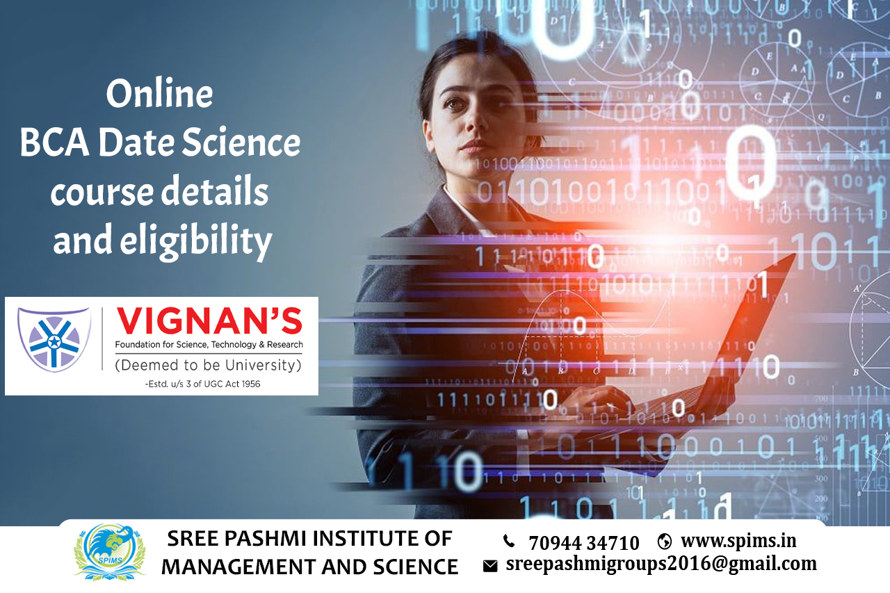 BCA Date Science course / BCA Date Science Degree/ BCA Date Science course Eligibility/ Scope of BCA Date Science course / Salary of BCA Date Science course / Importance of studying BCA Date Science course/ Subject involved in BCA Date Science course/ Benefits of taking BCA Date Science course / BCA Date Science course in Online Education/ Career opportunities for BCA Date Science graduate/ BCA Date Science course distance education / BCA Date Science course in top University India/ BCA Date Science course in top University Tamilnadu / BCA Date Science course in top University Coimbatore / BCA Date Science course in online education in Coimbatore/ BCA Date Science course in online education in Tamilnadu / BCA Date Science course in online education in India / BCA Date Science course in Vignan University. An online BCA Data Science course is designed to provide students with a solid foundation in computer applications and data science concepts. Generally, candidates should have completed their higher secondary education (10th, +2) or equivalent qualification from a recognized board or institution. A background in Science or mathematics may be preferred, but not always. It aims to equip students with the knowledge and skills required to work with data, analyze it, and derive insights to support decision-making processes. Here are some key topics covered in such courses: -Computer Programming -Data Analysis -Database Management -Mathematics and Statistics -Machine Learning -Data Mining -Big Data -Data Visualization -Data Ethics and Privacy -Data Science Projects The course curriculum generally includes subjects related to computer applications, data science, mathematics, statistics, programming, database management, and machine learning. Online BCA Data Science courses are typically delivered through virtual platforms, offering recorded lectures, live sessions, interactive discussions, and digital study materials. Here at Sree Pashmi Institute of Management and Science, you can find all types of UG, PG, Diploma, PG Diploma, and certificate programs in the distance and online education modes. Enrolling in distance or online education courses via Sree Pashmi Institute of Management and Science, you can get UGC-approved degree certificates along with A+ grade mark sheets from your enrolled University. Also, we provide the students with exclusive online courses, live sessions, and other educational benefits.