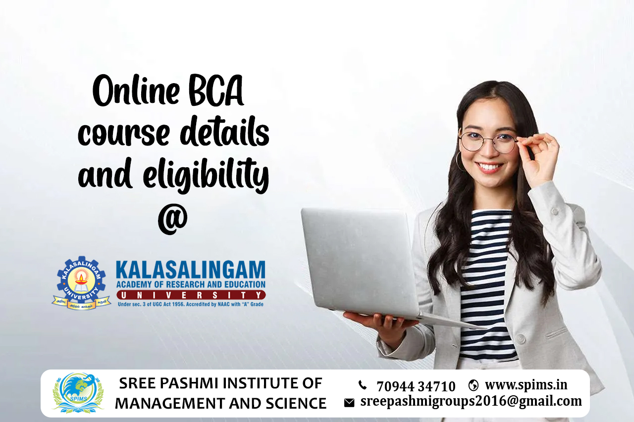 BCA/ Online BCA / BCA course / BCA Degree/ BCA Eligibility/ Scope of BCA / Salary of BCA / Importance of studying BCA/ Subject involved in BCA course/ Benefits of taking BCA / BCA in Online Education/ Career opportunities for BCA graduate/ BCA distance education /BCA in top University india/BCA in top University Tamilnadu /BCA in top University Coimbatore / BCA in online education in Coimbatore/ BBA in online education in Tamilnadu / BCA in online education in India /BCA in Kalasalingam university. Online Bachelor of Computer Applications (BCA) is an undergraduate degree program that focuses on computer science, programming, and software development. The graduates should have completed their 10th, +2 education from a recognized board or equivalent examination. The minimum percentage required in the qualifying examination may vary, but it is typically around 50% to 60%. Some universities may have specific subject requirements, such as Mathematics or Computer Science, at the 10th, +2 level. The Online BCA program generally has a duration of three years, divided into six semesters. However, some universities may offer an extended duration.The specific subjects and course structure may vary, but the core areas covered in a typical BCA program include: → Object-Oriented Programming → System Analysis and Design → Computer Architecture → Discrete Mathematics → Information Security and Cybersecurity → Artificial Intelligence and Machine Learning → Mobile Application Development → Cloud Computing → Programming Languages → Data Structures and Algorithms → Computer Networks → Database Management Systems → Operating Systems → Web Development → Software Engineering Sree Pashmi Institute of Management and Science is the leading institute for distance and online education in Coimbatore. All the study materials, E-materials, ID cards, Syllabus, Hall tickets, and Exam Time tables will be provided by us. You can gain proper guidance from commencing your course and placement facility till the completion of your course. Here you can get amazing distance education programs from well-reputed universities in and around India.