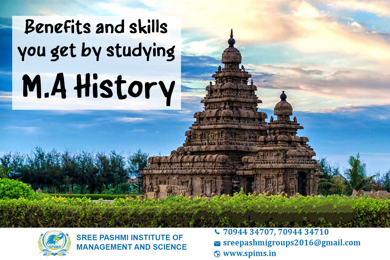 Benefits of studying M.A History/ M.A History What is it about/ Scope of M.A History/ Salary of M.A History/ Importance of studying M.A History/ Benefits of taking M.A History / Eligibility for pursuing M.A History/ Career opportunities for M.A History/ M.A History details. MA History is a two-year postgraduate degree course that deals with examining the history of various personalities and cultures belonging to different periods. MA History graduates have many job opportunities in various domains like arts, sociology, humanities, and psychology. The job roles include Lecturer, Professor, School Teacher, Private Tutor, Education, Consultant, Education Counselor, Vice Principal, and Assistant Editor, among others. → M.A. History degree serves as a basis for further higher studies and research in this field such as Ph.D. and M.Phil. Degree in History. On completion of this degree, a student can apply for the NET or JRF exam; success in these exams makes teaching or research a good option. → The M.A. History degree study trains students to read intelligently, think analytically, write clearly, accurately assess past trends, and rationally predict future developments, thus understanding the real world. → The degree course enables the students to develop a deep understanding of the evolution of human civilizations down the ages i.e. from the pre-historic to recent times. → M.A. History Employment Areas are Archaeology Sites, Historical Fiction Writing Archives, Historical Parks, Journalism, Museums and Art Galleries, Publishing Houses, Public Relation Offices, Survey Agencies, Tourism Industry, and so on. → M.A. History Job Types are Historian, Court Houses Archivist, Documentation Specialist Librarian, National Parks, and Historic Sites Manager, Library Systems Analyst, Research Assistant, Teacher and Lecturer, Records Manager, etc. Are you still waiting to start your distance learning? Sree Pashmi Institute of Management and Science in Coimbatore is the best choice for your higher education. Here you can get amazing distance education programs from well-reputed universities in and around India. Moreover, you can get full coordination from the start to the end of your course. So don’t wait to enroll in a distance education course at Sree Pashmi Institute of Management and Science and gain the benefits of quality education.