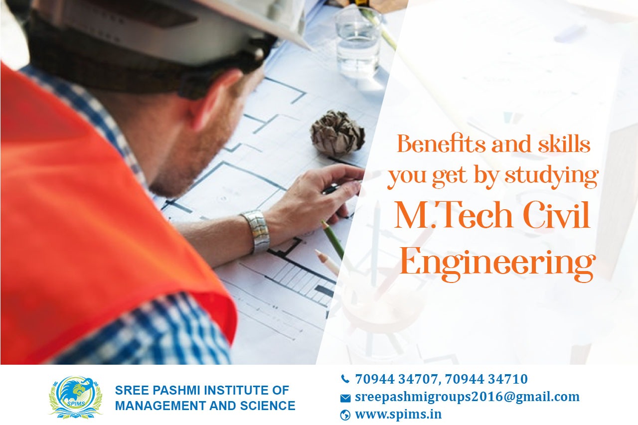 Benefits of taking M.Tech Civil Engineering / M.Tech Civil Engineering / M.Tech Civil Engineering What is it about/ Scope of M.Tech Civil Engineering / Salary of M.Tech Civil Engineering / Importance of studying M.Tech Civil Engineering/ M.Tech Civil Engineering distance education/ M.Tech Civil Engineering in distance education/ Eligibility for pursuing M.Tech Civil Engineering/ Career opportunities for M.Tech Civil Engineering graduate/Subject involved in M.Tech Civil Engineering course M.Tech Civil Engineering is a Post-Graduate Civil Engineering course. The M.Tech Civil Engineering program encompasses tasks such as planning, overseeing, and constructing public works such as roads, bridges, tunnels, buildings, airports, dams, water works, sewage systems, ports, and so on, and provides a variety of difficult professional options. M.Tech Civil Engineering is the most diverse and oldest of engineering disciplines. The M.Tech Civil Engineering degree provides a student with not only solid engineering knowledge but also excellent supervisory and administrative abilities. As long as there is a demand for new building structures, civil engineers will be needed to create them as well as maintain and repair existing facilities and buildings. As a result, the need for civil engineers is insatiable. The M.Tech in Civil Engineering degree usually has a lot of scope and possibility. Municipal corporations, rail, road, and airport building businesses, development companies, water supply departments, defense forces, and other infrastructure-related enterprises all provide excellent career prospects. The students with an M.Tech Civil Engineering degree can work as construction site supervisors, as well as in a managerial or design role. The holders of an M.Tech in Civil Engineering degree can also work as research and teaching professors in government and private institutions and organizations. The aspirants with an M.Tech Civil Engineering might also operate as independent consultants. After completing the M.Tech Civil Engineering course, the Civil engineers work on all major construction projects undertaken by the state or central government, railways, private construction firms, the military, engineering services, consultation services, and so on. Are you still waiting to start your distance learning? Sree Pashmi Institute of Management and Science in Coimbatore is the best choice for your higher education. Here you can get amazing distance education programs from well-reputed universities in and around India. Moreover, you can get full coordination from the start to the end of your course. So don’t wait to enroll in a distance education course at Sree Pashmi Institute of Management and Science and gain the benefits of quality education.