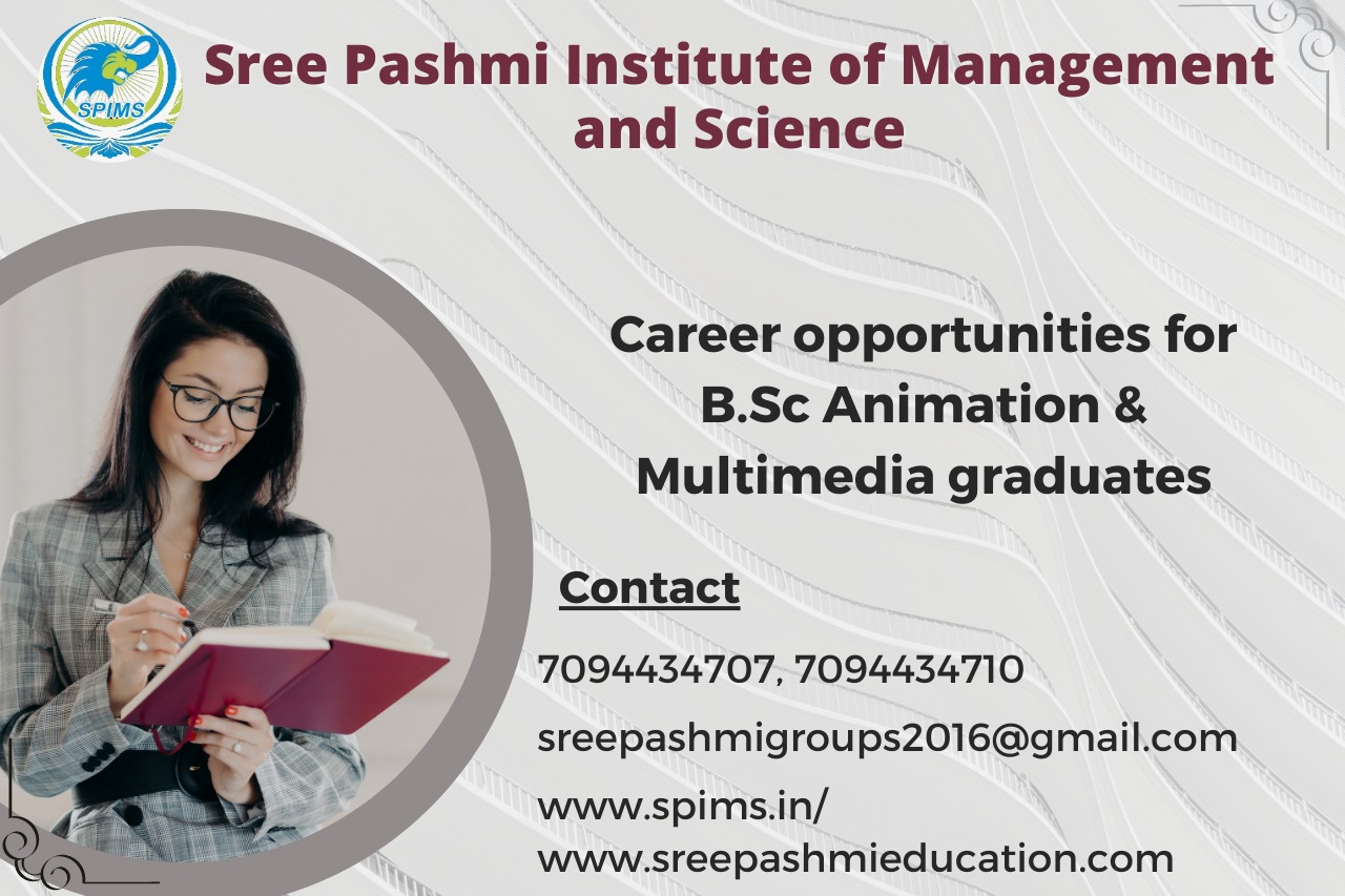 Career opportunities for B.Sc Animation and Multimedia graduate/ B.Sc Animation and Multimedia / B.Sc Animation and Multimedia What is it about/ Scope of B.Sc Animation and Multimedia / Salary of B.Sc Animation and Multimedia / Importance of studying B.Sc Animation and Multimedia/ B.Sc Animation and Multimedia distance education/ Benefits of taking B.Sc Animation and Multimedia / B.Sc Animation and Multimedia in distance education/ Eligibility for pursuing B.Sc Animation and Multimedia/ Subject involved in B.Sc Animation and Multimedia course. B.Sc Animation and Multimedia discipline is an undergraduate degree course that helps students to learn about the modern and advanced study of 2D and 3D animation techniques, areas of visual communication, and more. Through this B.Sc Animation and Multimedia course, the students can get detailed knowledge of different animation techniques, VFX, digital image processing techniques, digital film-producing technology, etc. The B.Sc Animation and Multimedia course are perfect for those students who have an interest in digital application, animation techniques, visual effects, and webpage designing and are passionate to work with national and international blue-chip animation studios and entertainment, gaming companies. The B.Sc Animation and Multimedia degree is specially designed to prepare qualified graduates for various prospective job roles like Web designer, software developer, graphic designer, animation graphic artist, game developer, game tester, art director, and more. After completing this course successfully, the graduates can have the opportunity to research further different multimedia designing techniques. The Recruiting areas include Educational Institutes, IT firms, Media, Advertising, TV Channels, Creative Production Houses, the Tourism industry, Private Consultancies, etc. The job profiles are Web Designer, Art Director, Graphic Designer, Software Developer, Animation Graphic Artist, Game Developer, etc. Sree Pashmi Institute of Management and Science is the leading distance education center in Coimbatore. Here you can find all UG, PG, Diploma, Certificate, and PG Diploma programs in the distance and online modes of education. Especially, when you join Sree Pashmi Institute of Management and Science, you can receive the 7-value added courses in the management field, such as HR, Technology Management, Entrepreneurship, Finance and accounting, Digital marketing, Sales and Marketing, and Personal Branding for free.
