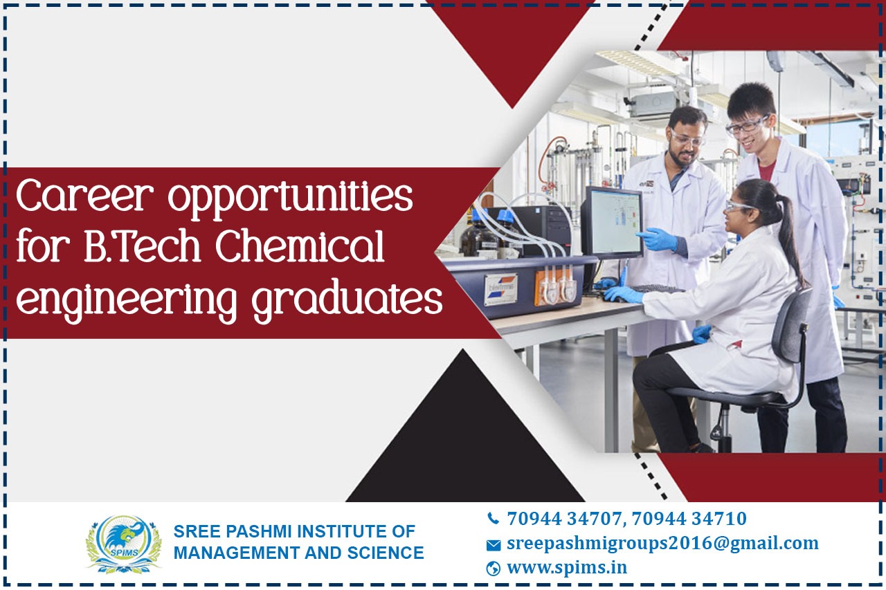 Career opportunities for B.Tech Chemical engineering / B.Tech Chemical engineering/ B.Tech Chemical engineering What is it about/ Scope of B.Tech Chemical engineering/ Salary of B.Tech Chemical engineering / Importance of studying B.Tech Chemical engineering / Benefits of taking B.Tech Chemical engineering / Eligibility for pursuing B.Tech Chemical engineering /B.Tech Chemical engineering course details. B.Tech Chemical Engineering has a wide range of career options, including Chemical Plant and System Operator, Manufacturing Production Technician, Food Scientist, Biotechnologist, Environmental and Healthcare Engineer, etc. After completing a B.Tech Chemical Engineering degree, students can enter any related organization and work as engineers. The jobs after B.Tech Chemical Engineering for freshers are; -Diploma Engineer -Trainee -Project Instrumentation Engineer -Chemical Engineer -HSE Officer -Production Engineer -Paint Engineering -Process Engineer -Executive - Engineering Store Job designation for B.Tech Chemical Engineering with experience are; -Solar Photovoltaic Installers -Wind Turbine Service Technicians -Software Developers and Engineers -Biomedical Engineers -Chemical Engineers -Civil Engineers -Electrical and Electronics Engineers -Environmental Engineers B.Tech Chemical Engineering graduates get placed in pharmaceuticals, healthcare, design and construction, pulp and paper, petrochemicals, food processing, specialty chemicals, etc. The average salary of the graduates of B.Tech Chemical Engineering is around INR 4.5 LPA. There is a wide scope for B.Tech Chemical Engineering graduates to work in diverse fields. The areas of recruitment are Oil and Gas Companies, Chemical Engineering Companies Fertilizer Companies, Process Engineering, Food and Drink Companies, Pharmaceutical Companies, Water Treatment Plants, Energy Companies, etc. Sree Pashmi Institute of Management and Science is the leading distance education center in Coimbatore. Here you can find all UG, PG, Diploma, Certificate, and PG Diploma programs in the distance and online modes of education. Especially, when you join Sree Pashmi Institute of Management and Science, you can receive 7-value added courses such as the management field, such as HR, Technology Management, Entrepreneurship, Finance and accounting, Digital marketing, Sales and Marketing, and Personal Branding for free.