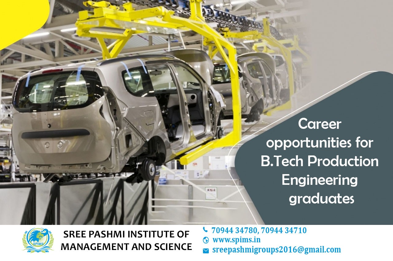 Career opportunities for B.Tech Production Engineering graduate/ B.Tech Production Engineering / B.Tech Production Engineering What is it about/ Scope of B.Tech Production Engineering / Salary of B.Tech Production Engineering / Importance of studying B.Tech Production Engineering/ B.Tech Production Engineering distance education/ Benefits of taking B.Tech Production Engineering / B.Tech Production Engineering in distance education/ Eligibility for pursuing B.Tech Production Engineering/ Subject involved in B.Tech Production Engineering course. Job opportunities after B.Tech Production Engineering in India for graduates aren't restricted, and it is very diverse that students can easily progress into any stream. With a degree in production engineering, these individuals are hired across various industries including Pharmaceuticals, Research Labs, manufacturing sectors, Communication sectors, Travel, Sports, Health, Information Technology, etc. Career after B.Tech Production Engineering courses are not limited as they have many options for growth and making their career in unique profiles and jobs. The scope of B.Tech Production Engineering in India lies in a broad range of sectors. B.Tech Production Engineering course presents the graduates with jobs that are very diverse for graduates who are keen and looking for a career. The most common job profiles that hire a B.Tech Production Engineering graduate are: → Production Engineer → Engineering Plant Production Manager → Process Engineer → Industrial Managers → Quality Engineers → Management Engineer → Operations Analyst → Manufacturing Engineer B.Tech Production Engineering jobs for graduates are very much abundant and wide open in the public and private sectors. The scope of Production Engineers in India and abroad is tremendous. Some areas of recruitment for graduates are: → Production Engineering Dept. → Educational Institutes → Metal Fabrication Units → Colleges and Universities → IT Companies Sree Pashmi Institute of Management and Science is the leading distance education center in Coimbatore. Here you can find all UG, PG, Diploma, Certificate, and PG Diploma programs in the distance and online modes of education. Especially, when you join Sree Pashmi Institute of Management and Science, you can receive the 7-value added courses in the management field, such as HR, Technology Management, Entrepreneurship, Finance and accounting, Digital marketing, Sales and Marketing, and Personal Branding for free.