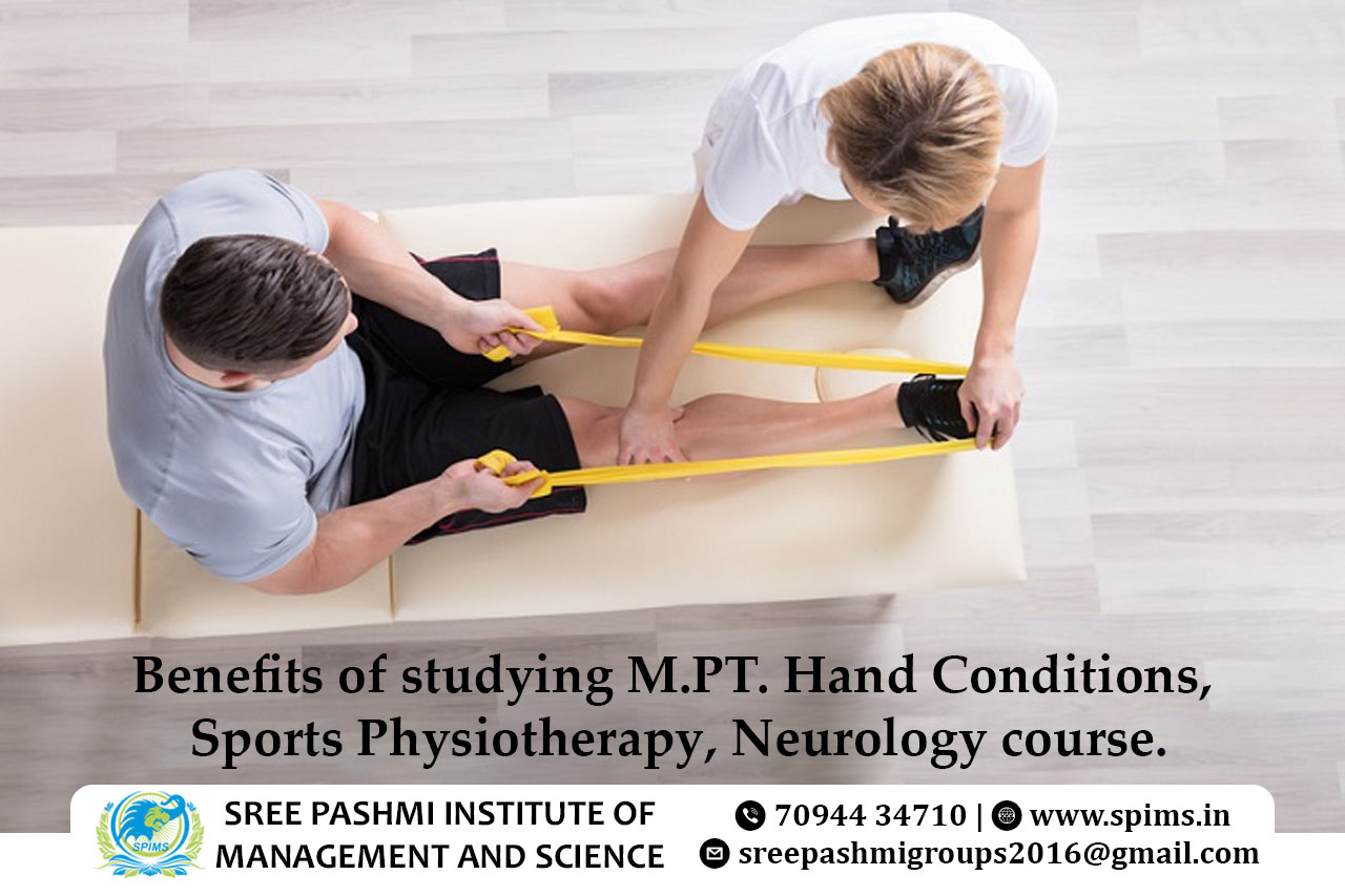 Career opportunities for M.PT. Hand Conditions, Sports Physiotherapy, Neurology course graduate/ M.PT. Hand Conditions, Sports Physiotherapy, Neurology / M.PT. Hand Conditions, Sports Physiotherapy, Neurology course / M.PT. Hand Conditions, Sports Physiotherapy, Neurology Degree/ M.PT. Hand Conditions, Sports Physiotherapy, Neurology course Eligibility/ Scope of M.PT. Hand Conditions, Sports Physiotherapy, Neurology course / Salary of M.PT. Hand Conditions, Sports Physiotherapy, Neurology course/ Importance of studying M.PT. Hand Conditions, Sports Physiotherapy, Neurology course/ M.PT. Hand Conditions, Sports Physiotherapy, Neurology course in top University India/ Subject involved in M.PT. Hand Conditions, Sports Physiotherapy, Neurology course/ Benefits of taking M.PT. Hand Conditions, Sports Physiotherapy, Neurology course/ M.PT. Hand Conditions, Sports Physiotherapy, Neurology course in online education in India / Online M.PT. Hand Conditions, Sports Physiotherapy, Neurology course/ M.PT. Hand Conditions, Sports Physiotherapy, Neurology course in Online Education/ M.PT. Hand Conditions, Sports Physiotherapy, Neurology in distance education / M.PT. Hand Conditions, Sports Physiotherapy, Neurology course in top University Tamilnadu / M.PT. Hand Conditions, Sports Physiotherapy, Neurology course in top University Coimbatore/ M.PT. Hand Conditions, Sports Physiotherapy, Neurology course in online education in Coimbatore/ M.PT. Hand Conditions, Sports Physiotherapy, Neurology course in online education in Tamilnadu. Studying for a Master of Physiotherapy (M.PT.) with specializations in Hand Conditions, Sports Physiotherapy, and Neurology offers numerous benefits, both professionally and personally. Here are some key advantages: The course provides in-depth knowledge and specialized skills in Hand Conditions, Sports Physiotherapy, and Neurology. Graduates become experts in these specific domains, enhancing their ability to address unique challenges and conditions within these fields.Specializing in these areas opens up a diverse range of career opportunities. Graduates can pursue roles in hospitals, rehabilitation centers, private clinics, sports teams, and orthopedic or neurology departments, among others. The specialized skills make them valuable assets in the healthcare industry. There is a growing demand for physiotherapists with specialized skills due to the increasing prevalence of hand-related conditions, the expanding sports industry, and the rising incidence of neurological disorders. Employers seek professionals with expertise to provide focused and effective treatments. Graduates contribute to holistic healthcare by addressing specific issues related to hands, sports injuries, and neurological conditions. This specialization allows them to play a crucial role in the overall well-being of patients, offering targeted and personalized interventions. Professionals with expertise in these areas often collaborate with other healthcare professionals, including orthopedic surgeons, neurologists, and sports physicians. This interdisciplinary approach enhances the quality of patient care and provides opportunities for continuous learning and collaboration.Specialized fields often involve ongoing research and innovation. Graduates may have the chance to contribute to advancements in treatment modalities, rehabilitation techniques, and healthcare technologies, keeping them at the forefront of their respective fields.Working in specialized areas allows physiotherapists to make a significant impact on the lives of individuals dealing with specific health challenges. The ability to contribute to a patient's recovery and well-being can bring a sense of personal satisfaction and fulfillment. Sree Pashmi Institute of Management and Science is the leading distance education center in Coimbatore. Here you can find all UG, PG, Diploma, Certificate, and PG Diploma programs in the distance and online modes of education. Especially, when you join Sree Pashmi Institute of Management and Science, you can receive 7-value added courses such as the management field, such as HR, Technology Management, Entrepreneurship, Finance and Accounting, Digital marketing, Sales and Marketing, and Personal Branding for free.