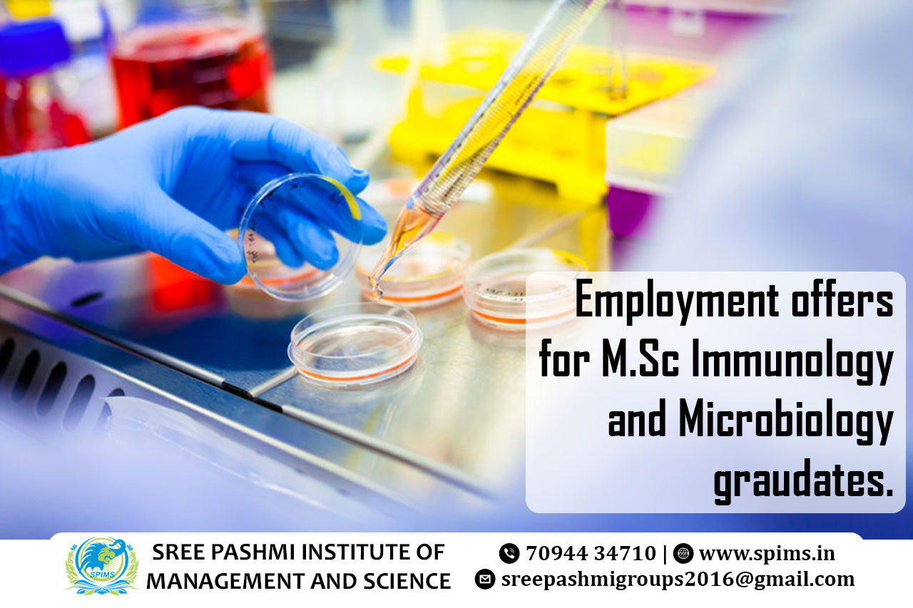 Career opportunities for M.Sc Immunology and Microbiologygraduate/ M.Sc Immunology and Microbiology / M.Sc Immunology and Microbiology course / M.Sc Immunology and Microbiology Degree/ M.Sc Immunology and Microbiology Eligibility/ Scope of M.Sc Immunology and Microbiology/ Salary of M.Sc Immunology and Microbiology / Importance of studying DM.Sc Immunology and Microbiology/ M.Sc Immunology and Microbiology in top University india/ Subject involved in M.Sc Immunology and Microbiology course/ Benefits of taking M.Sc Immunology and Microbiology / M.Sc Immunology and Microbiology in online education in India / Online M.Sc Immunology and Microbiology / M.Sc Immunology and Microbiology in Online Education/ M.Sc Immunology and Microbiology distance education / M.Sc Immunology and Microbiology in top University Tamilnadu / M.Sc Immunology and Microbiology in top University Coimbatore / M.Sc Immunology and Microbiology in online education in Coimbatore/ M.Sc Immunology and Microbiology in online education in Tamilnadu. M.Sc graduates in Immunology and Microbiology are in high demand across various sectors, leading to diverse employment opportunities. These graduates possess expertise in understanding the immune system, infectious diseases, and microbial biology, making them valuable in healthcare, research, pharmaceuticals, biotechnology, and public health sectors. In healthcare, M.Sc Immunology and Microbiology graduates can work in diagnostic laboratories, hospitals, and clinics, conducting tests, analyzing samples, and aiding in disease diagnosis. They may also contribute to vaccine development and research on diseases such as HIV, cancer, and autoimmune disorders. In the research sector, graduates can work in academic institutions, research organizations, and government agencies, conducting cutting-edge research on immunological disorders, infectious diseases, and antimicrobial resistance. They can also explore vaccine research, studying ways to prevent outbreaks and enhance public health.Pharmaceutical and biotechnology companies offer roles in drug discovery, development, and quality control. Graduates analyze the efficacy and safety of drugs, ensuring they meet regulatory standards. They may also work in bioprocessing, focusing on the production of therapeutic proteins, vaccines, and antibiotics. In the public health sector, graduates can work in government agencies, NGOs, and international organizations, contributing to disease surveillance, outbreak investigation, and healthcare policy development. They play a crucial role in controlling infectious diseases and promoting public health awareness.Furthermore, M.Sc Immunology and Microbiology graduates are well-suited for roles in clinical research, medical writing, regulatory affairs, and science communication. Their interdisciplinary knowledge allows them to adapt to various roles, ensuring a wide range of employment opportunities in both specialized and diverse fields related to immunology and microbiology. Sree Pashmi Institute of Management and Science is the leading distance education center in Coimbatore. Here you can find all UG, PG, Diploma, Certificate, and PG Diploma programs in the distance and online modes of education. Especially, when you join Sree Pashmi Institute of Management and Science, you can receive 7-value added courses such as the management field, such as HR, Technology Management, Entrepreneurship, Finance and Accounting, Digital marketing, Sales and Marketing, and Personal Branding for free.