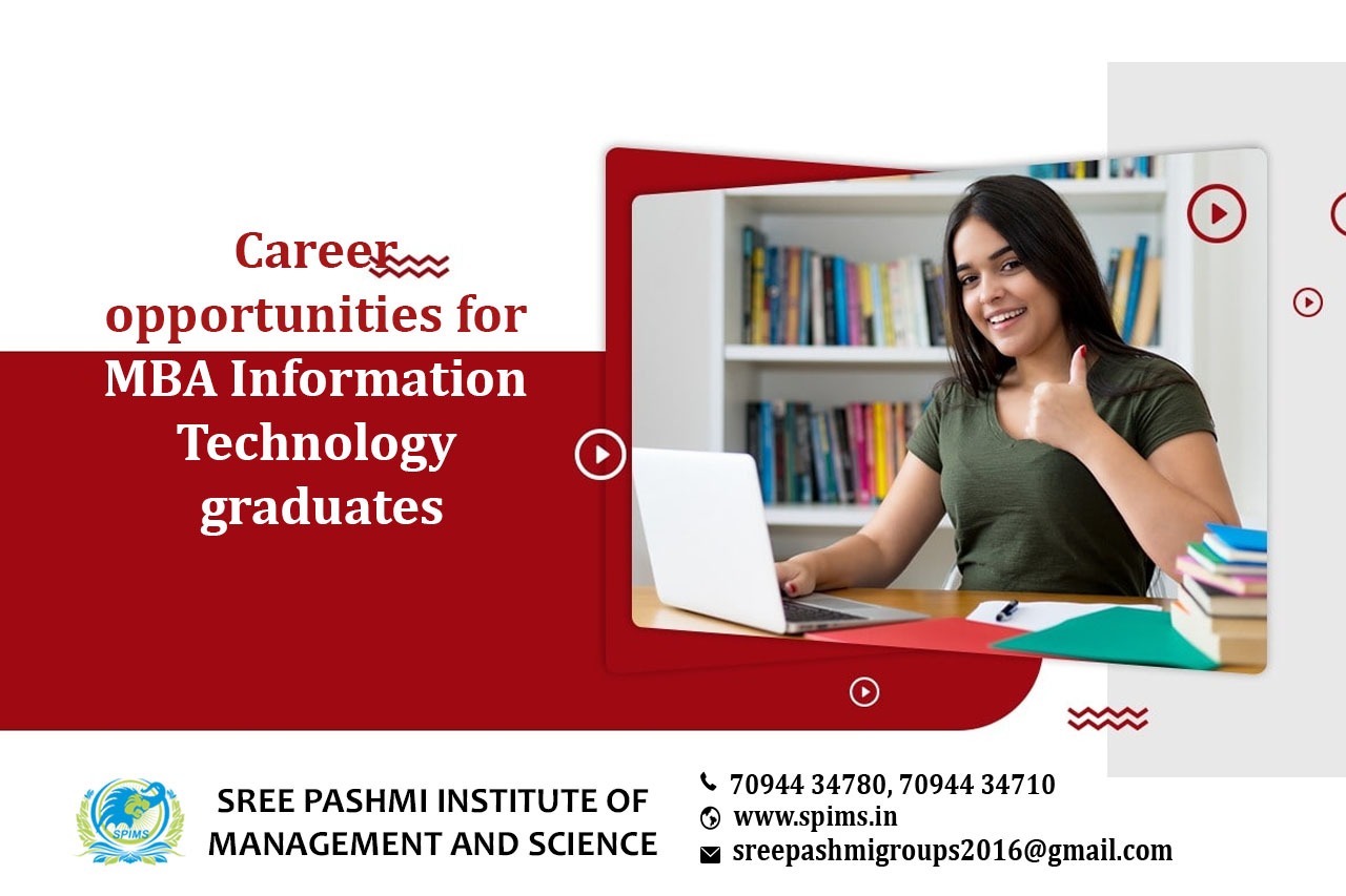 Career opportunities for MBA Information Technology graduate/ MBA Information Technology/ MBA Information Technology What is it about/ Scope of MBA Information Technology/ Salary of MBA Information Technology/ Importance of studying MBA Information Technology/ MBA Information Technology in distance education/ Benefits of taking MBA Information Technology/ MBA Information Technology distance education/ Eligibility for pursuing MBA Information Technology/ Subject involved in MBA Information Technology course. Jobs after MBA in IT are abundant with a good salary package. MBA IT does not restrict students to one particular field instead allows students to explore their career options in a wide range of areas. The acquired skills prepare the graduates to be open to other professions besides marketing ranging from consultancy to enterprising management. MBA IT jobs salary in India has an average INR 3 - 10 LPA package based on the sector one chooses to work. Jobs opportunities for MBA IT freshers are: → Product Manager → ERP Consultant → SAP Consultant → Systems Administrator → Network Administrator Jobs after MBA IT with experience: → Senior Project Manager → Business Analyst → IT Manager → Program Manager → Information Security Analyst MBA IT will help the students develop insights into the functioning of the market, technologies, and consumer behavior, which provides career opportunities in both government and private sectors. Some of the industries that provide MBA IT jobs are listed below. The areas of recruitment are: → Aerospace → Software → Banking → Health → Media → Education The average MBA in IT salary in Indian sectors is around INR 3 - 10 LPA. The other factors that affect the salary include the type of sector one chooses to work in and the job designation. Sree Pashmi Institute of Management and Science is the leading distance education center in Coimbatore. Here you can find all UG, PG, Diploma, Certificate, and PG Diploma programs in the distance and online modes of education. Especially, when you join Sree Pashmi Institute of Management and Science, you can receive 7-value added courses in the management field, such as HR, Technology Management, Entrepreneurship, Finance and accounting, Digital marketing, Sales and Marketing, and Personal Branding for free.