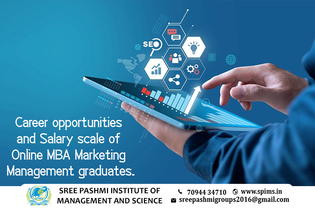 Career opportunities for MBA Marketing Management course graduate/ MBA Marketing Management course / MBA Marketing Management Degree/ MBA Marketing Management course Eligibility/ Scope of MBA Marketing Management course / Salary of MBA Marketing Management course/ Importance of studying MBA Marketing Management course/ Subject involved in MBA Marketing Management course/ Benefits of taking MBA Marketing Management course / MBA Marketing Management course in Online Education/ MBA Marketing Management course distance education / MBA Marketing Management course in top University India/ MBA Marketing Management course in top University Tamilnadu / MBA Marketing Management course in top University Coimbatore / MBA Marketing Management course in online education in Coimbatore/ MBA Marketing Management course in online education in Tamilnadu / MBA Marketing Management course in online education in India / Online MBA Marketing Management course. The Graduates with an online MBA in Marketing Management have a wide range of career options across industries due to their expertise in marketing strategies, consumer behavior analysis, and brand management. Here are several career paths to consider: → Marketing Manager → Brand Manager → Digital Marketing Manager → Product Manager → Market Research Analyst → Advertising Manager → Sales Manager → E-commerce Manager → Public Relations (PR) Manager → Entrepreneurship → Consulting → Non-Profit Marketing → Product Development Manager An Online MBA in Marketing Management opens doors to dynamic and evolving career opportunities, making graduates highly sought after by organizations looking to enhance their market presence and reach. The skills gained in this program, combined with practical experience, can lead to successful careers in marketing and related fields. Sree Pashmi Institute of Management and Science is the leading distance education center in Coimbatore. Here you can find all UG, PG, Diploma, Certificate, and PG Diploma programs in the distance and online modes of education. Especially, when you join Sree Pashmi Institute of Management and Science, you can receive 7-value added courses such as the management field, such as HR, Technology Management, Entrepreneurship, Finance and Accounting, Digital marketing, Sales and Marketing, and Personal Branding for free.