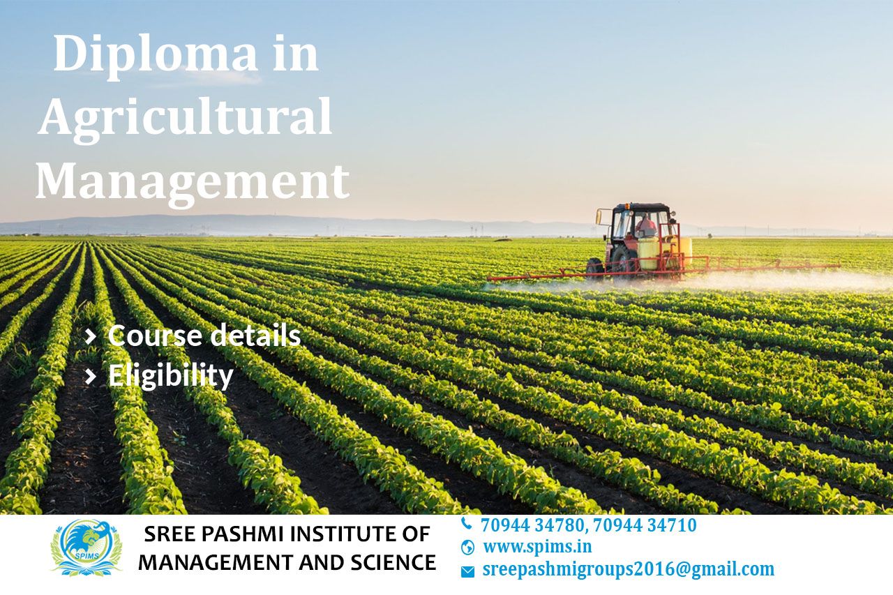 Diploma in Agricultural Management / Diploma in Agricultural Management What is it about/ Scope of Diploma in Agricultural Management / Salary of Diploma in Agricultural Management / Importance of studying Diploma in Agricultural Management/ Diploma in Agricultural Management distance education/ Benefits of taking Diploma in Agricultural Management / Diploma in Agricultural Management in distance education/ Eligibility for pursuing Diploma in Agricultural Management/ Career opportunities for Diploma in Agricultural Management graduate/Subject involved in Diploma in Agricultural Management course. Diploma in Agricultural Management is a full time course of 2-year duration which offers study about various topics regarding agriculture. This Diploma in Agricultural Management program deals with basic methodologies of farming. There are various specializations which are offered in the Diploma in Agriculture course such as seed technology, horticulture, animal husbandry, organic farming, etc. The average course fees range between INR 10, 000 to INR 40, 000. On the other hand the average salary in the agriculture sector is INR 558, 000 per annum making it one of the careers that offers an extremely high rate of return. The Diploma in Agricultural Management syllabus includes subjects such as Soils and Fertility Management, Principles of agronomy, Plant pathology, Principles of genetics, etc. After completing this course, students will be able to find work in various private and public sectors as an Agricultural Engineer, Business Manager, Research Associate, Agricultural Inspector, Agricultural Ecologist, Lecturer etc. -Students who wish to pursue a Diploma in Agricultural Management course must fulfil the following eligibility criteria. -The students must have passed Class 10 -The candidate must have a minimum of 50% marks in aggregate. -5% relaxation in marks will be given to candidates belonging to SC/ST/OBC, differently abled, and other categories. Here at Sree Pashmi Institute of Management and Science, you can find all types of UG, PG, Diploma, PG Diploma, and certificate programs in distance and online education modes. Enrolling in distance or online education courses via Sree Pashmi Institute of Management and Science, you can get UGC-approved degree certificates along with A+ grade mark sheets from your enrolled University. Also, we provide the students with exclusive online courses, live sessions, and other educational benefits.