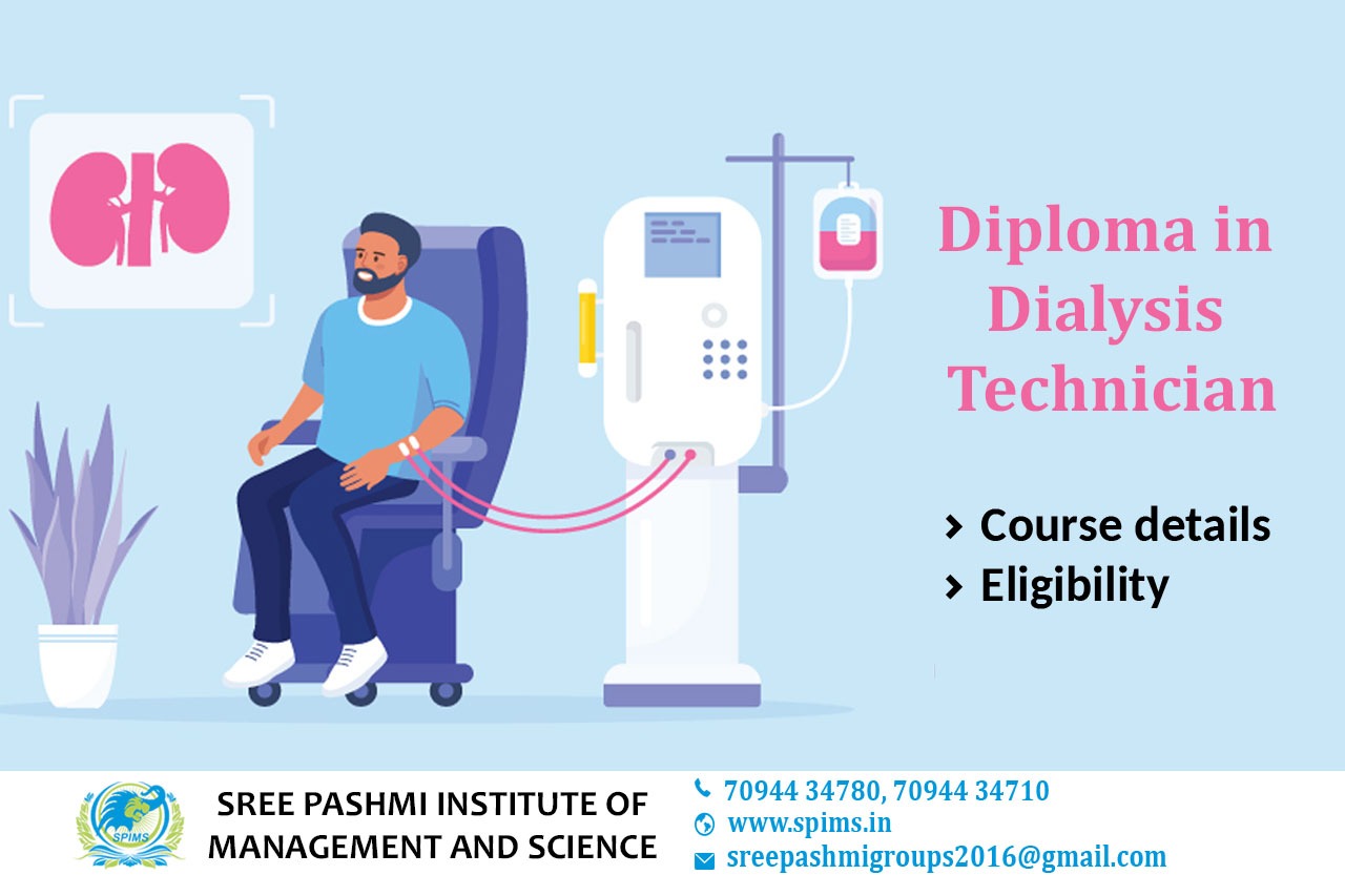 Diploma in Dialysis Technician / Diploma in Dialysis Technician What is it about/ Scope of Diploma in Dialysis Technician / Salary of Diploma in Dialysis Technician / Importance of studying Diploma in Dialysis Technician/ Diploma in Dialysis Technician distance education/ Benefits of taking Diploma in Dialysis Technician / Diploma in Dialysis Technician in distance education/ Eligibility for pursuing Diploma in Dialysis Technician/ Career opportunities for Diploma in Dialysis Technician graduate/Subject involved in Diploma in Dialysis Technician course. Diploma in Dialysis Technician is a 2-year skilled-based certification course that trains students to purify and filter the blood and excess or waste materials from the human kidney. It also enables students to perform critical dialysis including renal dialysis and hemodialysis. The Diploma in Dialysis Technician students is taught the proper usage of dialysis machines as well as the dialysis technique on the whole. As a result, they become well-trained dialysis technicians and can work more aptly in the hospital and medical centers, especially, dialysis centers. The Diploma in Dialysis Technician candidates must check the eligibility criteria from the following points before applying for the diploma in Dialysis Technique. → Each student must pass 10th, +2 examinations from the science stream from a recognized state or Central Board. → Interested candidates must score a minimum percentage of 50 marks for the general category, or 50 marks for the reserved category in their 10th, +2 examinations to apply for the Diploma course. → The Diploma in Dialysis Technician candidates must have studied Physics as well as chemistry in their 11th, +12 standard. Also, the students must be well-known in Biology or Mathematics of 12th standard. → The candidate must have completed 17 years of age and must be less than 25 years of age at the time of joining the course. Here at Sree Pashmi Institute of Management and Science, you can find all types of UG, PG, Diploma, PG Diploma, and certificate programs in the distance and online education modes. Enrolling in distance or online education courses via Sree Pashmi Institute of Management and Science, you can get UGC-approved degree certificates along with A+ grade mark sheets from your enrolled University. Also, we provide the students with exclusive online courses, live sessions, and other educational benefits.