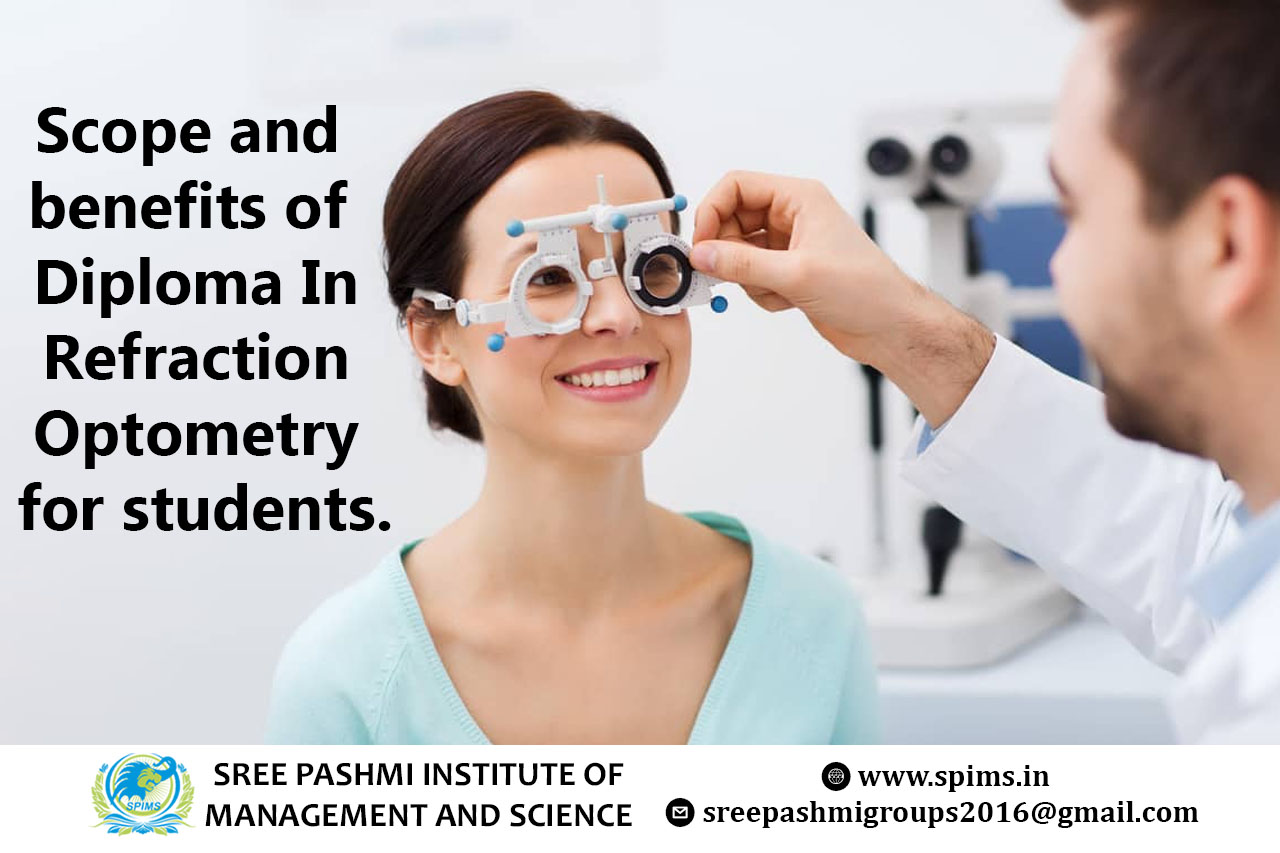 Diploma In Refraction Optometry / Diploma In Refraction Optometry course / Diploma In Refraction Optometry Degree/ Diploma In Refraction Optometry Eligibility/ Scope of Diploma In Refraction Optometry/ Salary of Diploma In Refraction Optometry/ Importance of studying Diploma In Refraction Optometry/ Subject involved in Diploma In Refraction Optometry course/ Benefits of taking Diploma In Refraction Optometry/ Diploma In Refraction Optometry in Online Education/ Career opportunities for Diploma In Refraction Optometry graduate/Diploma In Refraction Optometry in distance education / Diploma In Refraction Optometry in top University India/Diploma In Refraction Optometry Tamilnadu / Diploma In Refraction Optometry in top University Coimbatore/ Diploma In Refraction Optometry in online education in Coimbatore/ Higher studies after Diploma In Refraction Optometry course/Diploma In Refraction Optometry in online education in Tamilnadu / Diploma In Refraction Optometry in online education in India/ Advantages of Diploma In Refraction Optometry/ Significance of Diploma In Refraction Optometry. A Diploma in Refraction Optometry opens doors to a rewarding career in eye care, focusing on assessing and correcting vision problems. For students, it brings both fulfilling professional prospects and enriching learning experiences. Scope: High Demand: The rising awareness of eye health, increasing digital screen time, and aging population fuel the demand for competent optometrists. Refraction specialists play a crucial role in primary eye care, ensuring access for all. Diverse Career Options: Graduates can work in various settings like hospitals, optical stores, lens manufacturing companies, and even schools. They can choose independent practice, employment, or collaboration with ophthalmologists. Specialization Potential: Further education unlocks avenues like pediatric optometry, sports vision, low vision rehabilitation, and co-management of refractive surgeries, expanding career options and earning potential. Benefits: Job Security: With the rising demand, qualified refraction optometrists face excellent job security and career progression opportunities. Direct Impact on Lives: Witnessing the positive impact on patients' vision and well-being brings immense personal satisfaction and a sense of purpose. Continual Learning: The field's constant advancements in technology and diagnostic methods ensure a stimulating and intellectually engaging career. Work-Life Balance: Unlike some healthcare professions, optometry often offers regular working hours and a manageable workload, promoting a better work-life balance. The Diploma in Refraction Optometry offers a promising, impactful, and personally enriching career path. It equips students with vital skills, opens doors to diverse opportunities, and allows them to make a real difference in people's lives. Here at Sree Pashmi Institute of Management and Science, you can find all types of UG, PG, Diploma, PG Diploma, and certificate programs in the distance and online education modes. Enrolling in distance or online education courses via Sree Pashmi Institute of Management and Science, you can get UGC-approved degree certificates along with A+ grade mark sheets from your enrolled University. Also, we provide the students with exclusive online courses, live sessions, and other educational benefits.