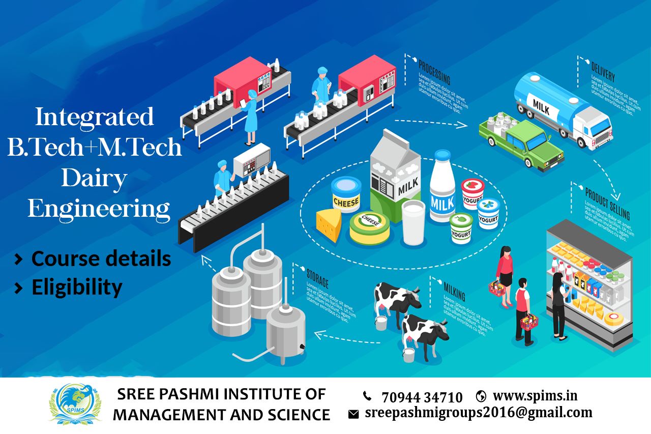Integrated B.Tech+ M.Tech Dairy Engineering / Integrated B.Tech+ M.Tech Dairy Engineering course /Integrated B.Tech+ M.Tech Dairy Engineering Degree/ Integrated B.Tech+ M.Tech Dairy Engineering Eligibility/ Scope of Integrated B.Tech+ M.Tech Dairy Engineering / Salary of Integrated B.Tech+ M.Tech Dairy Engineering / Importance of studying Integrated B.Tech+ M.Tech Dairy Engineering/ Subjects involved Integrated B.Tech+ M.Tech Dairy Engineering course/ Benefits of taking Integrated B.Tech+ M.TechDairy Engineering/ Integrated B.Tech+ M.Tech Dairy Engineering in Online Education/ Career opportunities for Integrated B.Tech+ M.Tech Dairy Engineering graduate/ Integrated B.Tech+ M.Tech Dairy Engineering distance education. Integrated B.Tech+M.Tech Dairy Engineering is a specialized program that combines both undergraduate and postgraduate studies in dairy engineering. It is designed to provide students with in-depth knowledge and skills related to the dairy industry, including dairy processing, dairy product manufacturing, quality control, and dairy plant management. To be eligible for an Integrated B.Tech+M.Tech Dairy Engineering program, candidates must typically meet the following criteria: Educational Qualification: Candidates must have completed their 10th, +2 education with a minimum of 50-60% marks in the science stream (Physics, Chemistry, and Mathematics) from a recognized board. Entrance Exam: Candidates may be required to qualify for entrance exams conducted by universities or institutions offering the program. The specific entrance exam requirements may vary depending on the institution. SPIMS is the leading distance education center in Coimbatore. Especially, you can receive 7-value added course such as management field, such as HR, Technology Management, Entrepreneurship, Finance and accounting, Digital marketing, Sales and Marketing, and Personal Branding for free.
