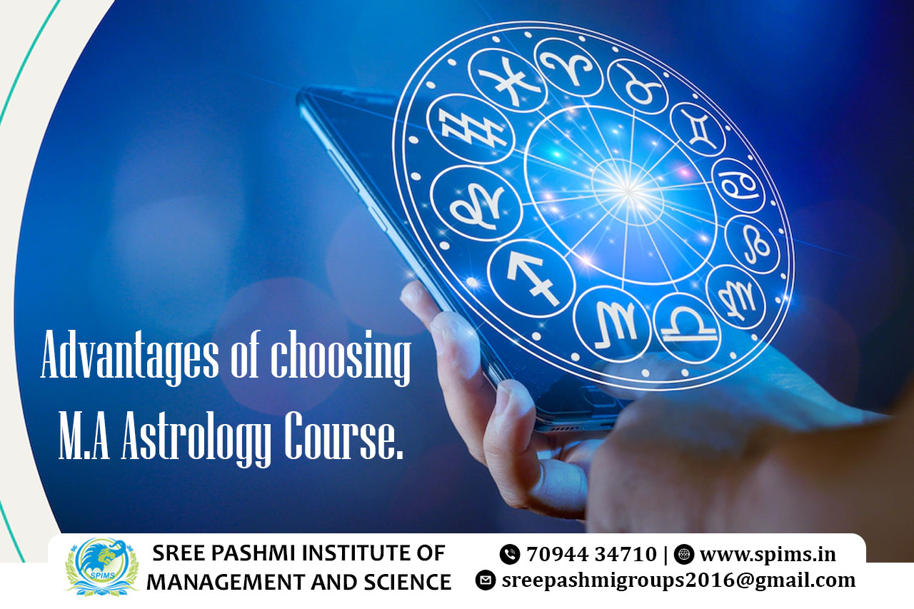 M.A. Astrology / M.A. Astrology course / M.A. Astrology Degree/ M.A. Astrology course Eligibility/ Scope of M.A. Astrology course / Salary of M.A. Astrology course/ Importance of studying M.A. Astrology course/ M.A. Astrology course in top University India/ Subject involved in M.A. Astrology course/ Benefits of taking M.A. Astrology course/ M.A. Astrology course in online education in India / Online M.A. Astrology course/ M.A. Astrology course in Online Education/ Career opportunities for M.A. Astrology course graduate/M.A. Astrology in distance education / M.A. Astrology course in top University Tamilnadu / M.A. Astrology course in top University Coimbatore / M.A. Astrology course in online education in Coimbatore/ M.A. Astrology course in online education in Tamilnadu. Choosing to pursue a Master of Arts (M.A) in Astrology offers several advantages, combining academic study with the ancient and intricate field of astrology. Here are some key advantages: The M.A in Astrology provides a comprehensive and in-depth understanding of astrology, covering its historical, philosophical, and practical aspects. Students gain proficiency in interpreting astrological charts, predicting events, and understanding the cosmic influences on human life.Students are exposed to a holistic perspective that integrates astrology into broader cultural, historical, and spiritual contexts. This allows for a well-rounded education that goes beyond the technical aspects of astrological chart reading.The program explores the cultural and historical significance of astrology across civilizations, providing students with insights into how astrology has shaped societies and influenced various aspects of human life.Graduates are equipped with the skills to practice astrology professionally. This may involve providing consultations, creating birth charts, and offering guidance based on astrological principles. The program often includes practical training to enhance the application of theoretical knowledge.Students have the opportunity to engage in research within the field of astrology. This can involve exploring new astrological techniques, investigating historical astrological practices, or contributing to the evolving body of astrological knowledge. The study of astrology often leads to personal and spiritual growth. Students gain insights into their own lives and develop a deeper connection with the cosmos. This personal transformation can be a significant advantage for individuals seeking a more profound understanding of themselves and their purpose.Graduates can pursue various career paths, including astrological counseling, writing, teaching, or working in the media. There is a growing interest in astrology, and professionals with advanced degrees in the field may find unique opportunities in today's society.The M.A in Astrology allows students to explore these interdisciplinary connections, providing a broader and more nuanced approach to their practice.Community and Networking:Students have the chance to engage with a community of like-minded individuals who share a passion for astrology. Networking within this community can lead to collaboration, mentorship, and ongoing professional development. Here at Sree Pashmi Institute of Management and Science, you can find all types of UG, PG, Diploma, PG Diploma, and certificate programs in the distance and online education modes. Enrolling in distance or online education courses via Sree Pashmi Institute of Management and Science, you can get UGC-approved degree certificates along with A+ grade mark sheets from your enrolled University. Also, we provide the students with exclusive online courses, live sessions, and other educational benefits.