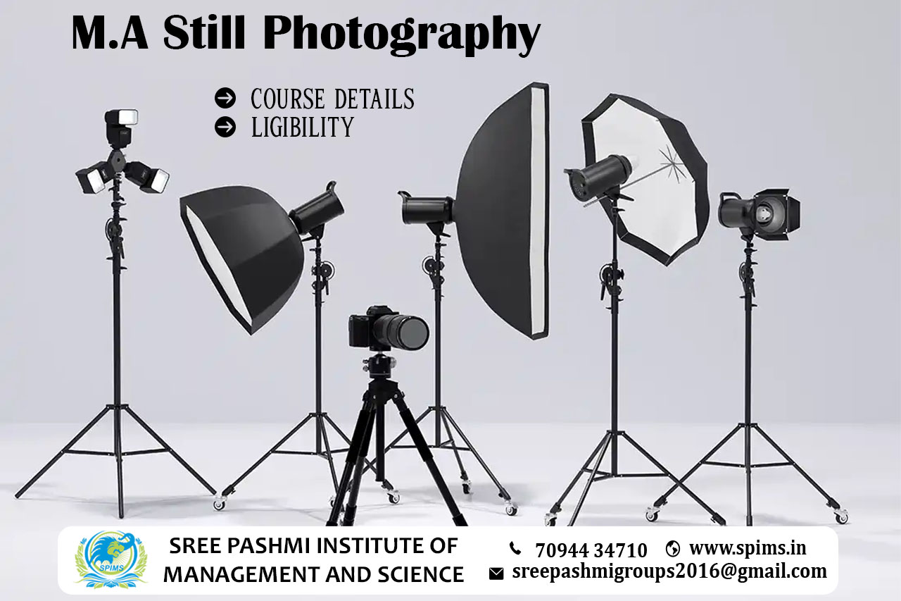 M.A Still Photography / M.A Still Photography course / M.A Still Photography Degree / M.A Still Photography Eligibility / Scope of M.A Still Photography / Salary of M.A Still Photography / Importance of studying M.A Still Photography / Subject involved in M.A Still Photography course / Benefits of taking M.A Still Photography / M.A Still Photography in Online Education / Career opportunities for M.A Still Photography graduate / M.A Still Photography distance education. M.A Still Photography is a postgraduate course that focuses on the study and practice of still photography as a fine art form. The course typically delves into various aspects of photography, including techniques, aesthetics, composition, lighting, post-processing, and visual storytelling. It provides students with advanced knowledge and skills to excel in the field of still photography. The eligibility for M.A Still Photography may vary depending on the institution offering the course. To be eligible for a Master of Arts in Still Photography, you must have completed a Bachelor of Arts (BA) degree in a related field, such as photography, fine arts, visual arts, or a related field. You may also need to demonstrate a portfolio of still photography work that is relevant to the degree program you are applying for. Additionally, some schools may also require you to submit a personal statement or other materials that demonstrate your commitment to the field. Here at Sree Pashmi Institute of Management and Science, you can find all types of UG, PG, Diploma, PG Diploma, and certificate programs in the distance and online education modes. Enrolling in distance or online education courses via Sree Pashmi Institute of Management and Science, you can get UGC-approved degree certificates and A+ grade mark sheets from your enrolled University. Also, we provide the students with exclusive online courses, live sessions, and other educational benefits.