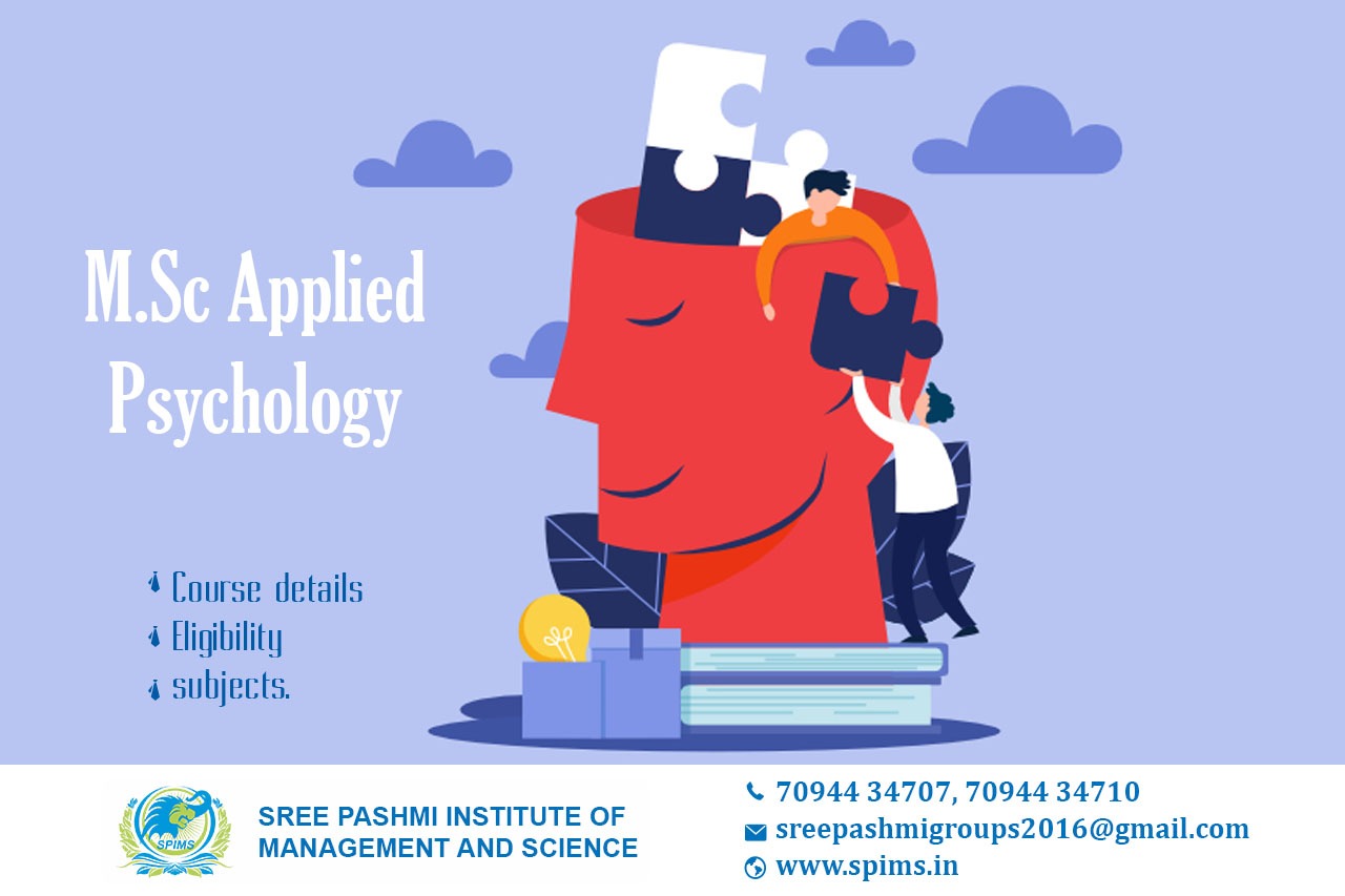 M.Sc Applied Psychology/ M.Sc Applied Psychology What is it about/ Scope of M.Sc Applied Psychology/ Salary of M.Sc Applied Psychology / Importance of studying M.Sc Applied Psychology/ M.Sc Applied Psychology in distance education/ Benefits of taking Disaster Management /M.Sc Applied Psychology distance education/ Eligibility for pursuing M.Sc Applied Psychology/ Career opportunities for M.Sc Applied Psychology graduate/Subject involved in M.Sc Applied Psychology course. M.Sc Applied Psychology is a two-year-long postgraduate course that deals with key aspects of the application of psychological studies in several real-life scenarios and trains graduates on psychological studies of organizations and industries. Upon the completion of the M.Sc Applied Psychology course duration, there are many job opportunities available to the graduates. Some of the job roles that the students can start with include Human Resource Manager, Marketing Manager, Data Analyst, User Experience Architect, and more. M.Sc Applied Psychology admission is only possible for the students if they ensure that they meet the eligibility criteria for the course. The M.Sc Applied Psychology eligibility criteria include students must complete their bachelor’s degree in the field of psychology, with a minimum aggregate of 55%. Additionally, they must appear in the entrance exams required for admission. There is no age limit in the eligibility for the BA Correspondence in India. M.Sc Applied Psychology syllabus is a two-year-long postgraduate degree that introduces students to all the vital aspects of the application of psychological studies in several real-life scenarios and trains the graduates on the psychological studies of organizations and industries. Listed below are the Master of Science in Applied Psychology subjects that the students study: → Advanced Social Psychology → Child Development → Theories of Personality → Psychological Research Methodology → Clinical Training: Experimental Psychology → General Psychology → Basic Psychopathology Here at Sree Pashmi Institute of Management and Science, you can find all types of UG, PG, Diploma, PG Diploma, and certificate programs in distance and online education modes. Enrolling in distance or online education courses via Sree Pashmi Institute of Management and Science, you can get UGC-approved degree certificates along with A+ grade mark sheets from your enrolled University. Also, we provide the students with exclusive online courses, live sessions, and other educational benefits.