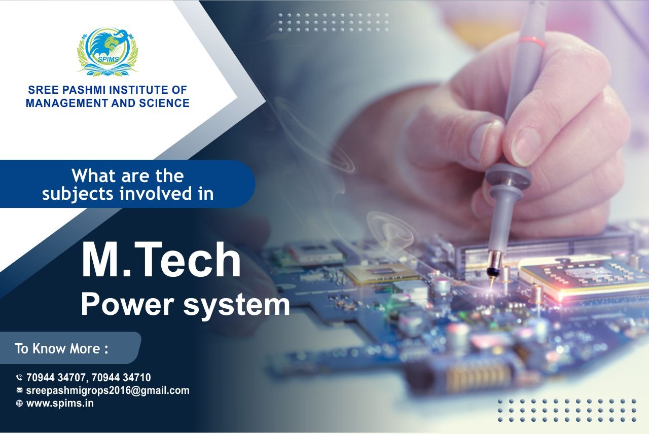 M.Tech Power system / M.Tech Power system What is it about/ Scope of M.Tech Power system / Salary of M.Tech Power system/ Importance of studying M.Tech Power system/ Benefits of taking M.Tech Power system M.Tech Power system/ M.Tech Power system in distance education/Eligibility for pursuing M.Tech Power system. The semester-wise M.Tech Power System Engineering subjects are designed to enhance the overall knowledge and give a deep understanding of the concepts to the students. The M.Tech Power System Engineering syllabus includes both theoretical classroom-based teaching and practical lab sessions for a better understanding of advanced application-related topics. The curriculum consists of both core and elective subjects to make the two-year-long program more flexible. The M.Tech Power System Engineering subjects list is as follows: → Power System Analysis and Operation → Power System Dynamics and Control → HVDC and Flexible AC Transmission Systems → Electric Power Quality → Power System Protection A few necessary skills for M.Tech Power System Engineering graduates are Complex Problem-Solving Skills, Strong Analytical Skills, Good Technical Skills, Team Management, Critical Thinking, and Strong Risk Assessment Skills. The program is beneficial for those interested in pursuing a career in power engineering or further study at the Ph.D. level. It also provides you with in-depth knowledge of novel types of electric drives and solid-state power converters, as well as their associated control systems, with an emphasis on computer control. M.Tech Power System Engineering syllabus is curated for two years and divided into four semesters. The syllabus is designed to introduce aspirants to processes of monitoring, developing, designing, and evaluating high-end power systems for managing a variety of challenging projects and research work. The postgraduate power system engineering course consists of both core and elective subjects that students can choose from. Some common M.Tech Power System Engineering subjects are Renewable and Distributed Energy Sources, Industrial Instrumentation, Smart Grid Technology, Advanced Digital Signal Processing, etc. Contact Sree Pashmi Institute of Management and Science to get enrolled for distance education degrees in the best-reputed university. This is the best leading institute for distance education in Coimbatore. All the study materials, E-materials, ID cards, Syllabus, Hall tickets, and Exam Time tables will be provided by us. You will get the proper guidance from the start till finishing your degree without any difficulties in between.