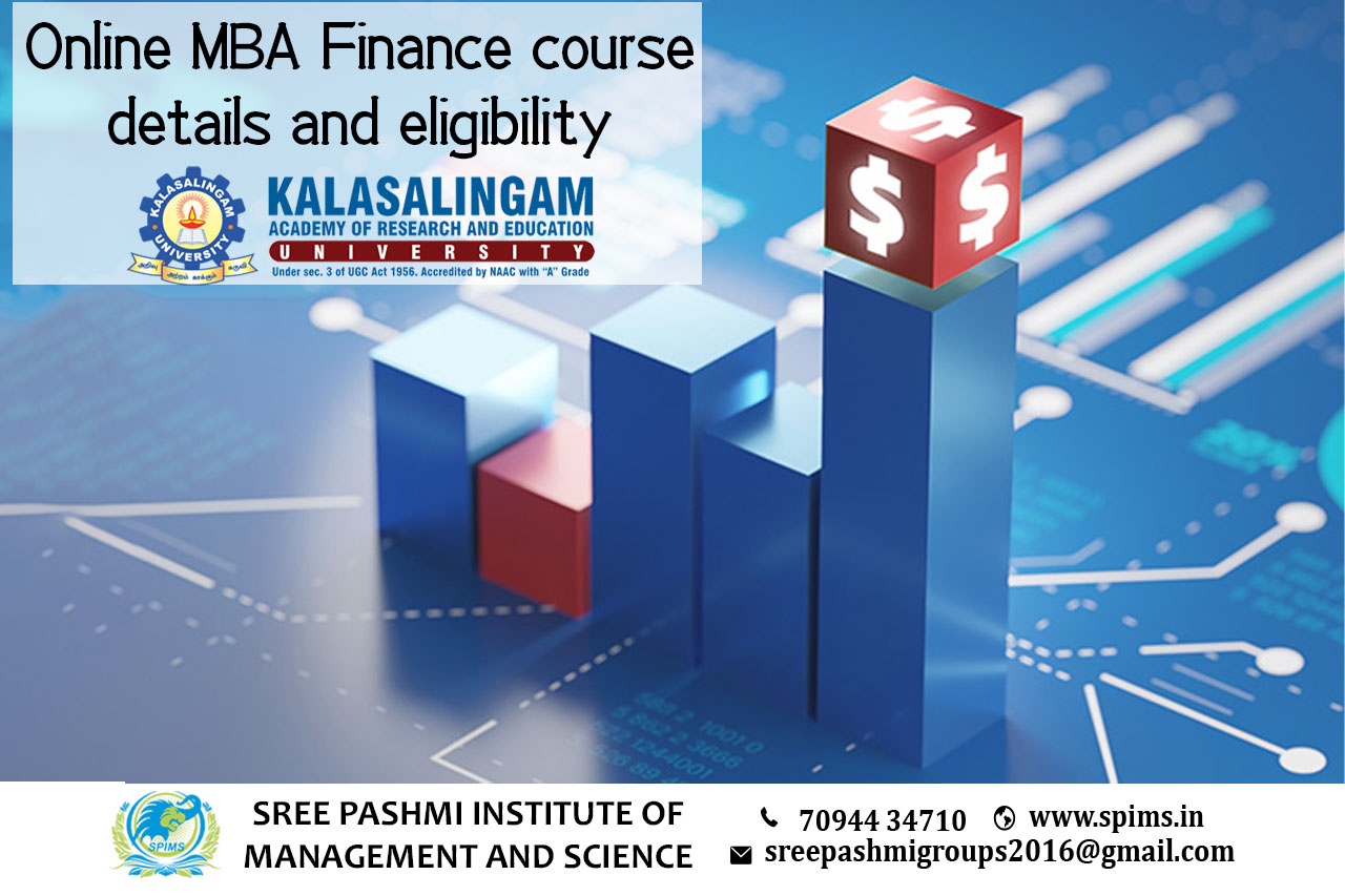 MBA Finance course MBA Finance course Degree/ MBA Finance course Eligibility/ Scope of MBA Finance course / Salary of MBA Finance course / Importance of studying MBA Finance course/ Subject involved in MBA Finance course/ Benefits of taking MBA Finance course / MBA Finance course in Online Education/ Career opportunities for MBA Finance course graduate/ MBA Finance course distance education / MBA Finance course in top University India/ MBA Finance course in top University Tamilnadu / MBA Finance course in top University Coimbatore / MBA Finance course in online education in Coimbatore/ MBA Finance course in online education in Tamilnadu / MBA Finance course in online education in India / MBA Finance course in Kalasalingam University. Online MBA in Finance is a postgraduate degree program that focuses on developing skills and knowledge in financial management, investments, financial analysis, and related areas. MBA in Finance programs last 2 years, divided into four semesters. A bachelor's degree in any discipline from a recognized university or institution is generally required. A minimum percentage or CGPA is a requirement for admission is minimum of 50% or a CGPA of 2.5 on a 4.0 scale is common. MBA Finance programs may vary across institutions. However, common subjects and areas of study include: Financial Management, Investments and Portfolio Management, Financial accounting, Managerial Accounting, Corporate Finance, Financial Markets and Institutions, Risk Management, International Finance, Financial Statement Analysis, Derivatives and Risk Management, Business Valuation, Capital Budgeting, Financial Modelling, Strategic Financial Management, Mergers and Acquisitions, Corporate Governance. Additionally, elective courses and specialization options may be available, allowing students to focus on specific areas within finance, such as investment banking, corporate finance, or financial analytics. Contact Sree Pashmi Institute of Management and Science to get enrolled for distance education degrees in the best-reputed university. This is the best leading institute for distance education in Coimbatore. All the study materials, E-materials, ID cards, Syllabus, Hall tickets, and Exam Time tables will be provided by us. You will get the proper guidance from the start till finishing your degree without any difficulties in between.