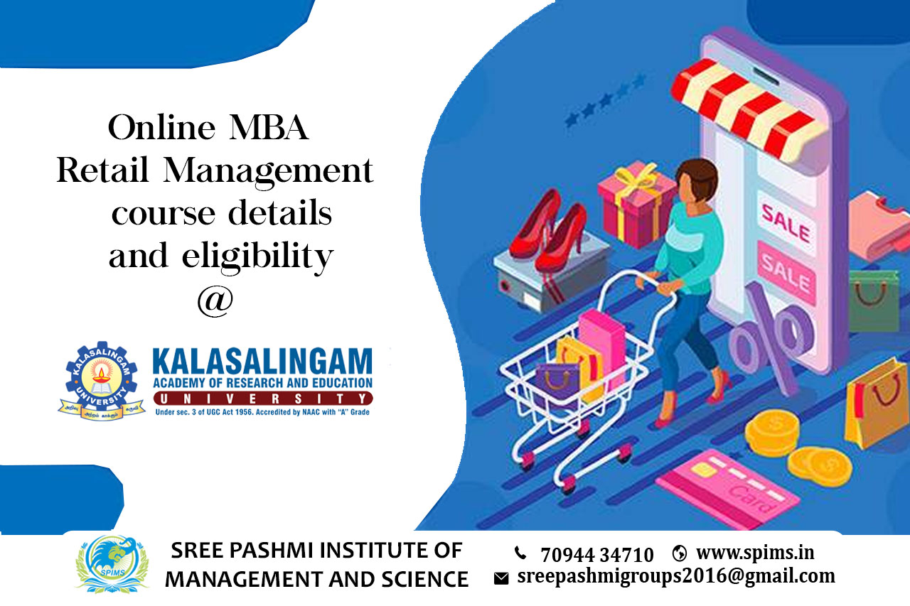 MBA Retail Management course / MBA Retail Management Degree/ MBA Retail Management course Eligibility/ Scope of MBA Retail Management course / Salary of MBA Retail Management course / Importance of studying MBA Retail Management course/ Subject involved in MBA Retail Management course/ Benefits of taking MBA Retail Management course / MBA Retail Management course in Online Education/ Career opportunities for MBA Retail Management course graduate/ MBA Retail Management course distance education / MBA Retail Management course in top University India/ MBA Retail Management course in top University Tamilnadu / MBA Retail Management course in top University Coimbatore / MBA Retail Management course in online education in Coimbatore/ MBA Retail Management course in online education in Tamilnadu / MBA Retail Management course in online education in India / MBA Retail Management course in Kalasalingam University. Online MBA in Retail Management programs last two years for full-time courses. An Online MBA in Retail Management is a specialized program designed to provide students with the knowledge and skills required to manage retail businesses effectively. The MBA in Retail Management program typically covers a wide range of subjects related to retail business management. Some of the key topics included in the curriculum may be: → Supply Chain Management in Retail → Retail Store Management → Retail Finance and Budgeting → E-commerce and Online Retailing → Strategic Retail Management → Retail Entrepreneurship and Innovation → Retail Operations Management → Retail Marketing and Merchandising → Customer Relationship Management → Retail Analytics and Data-driven Decision Making The Online MBA in Retail Management course focuses on various aspects of retail operations, marketing, merchandising, customer service, and supply chain management. However, applicants must have completed a bachelor's degree in any discipline from a recognized university. Sree Pashmi Institute of Management and Science is the leading distance education center in Coimbatore. Here you can find all UG, PG, Diploma, Certificate, and PG Diploma programs in the distance and online modes of education. Especially, when you join the Sree Pashmi Institute of Management and Science, you can receive 7-value added courses such as the management field, such as HR, Technology Management, Entrepreneurship, Finance and accounting, Digital marketing, Sales and Marketing, and Personal Branding for free.
