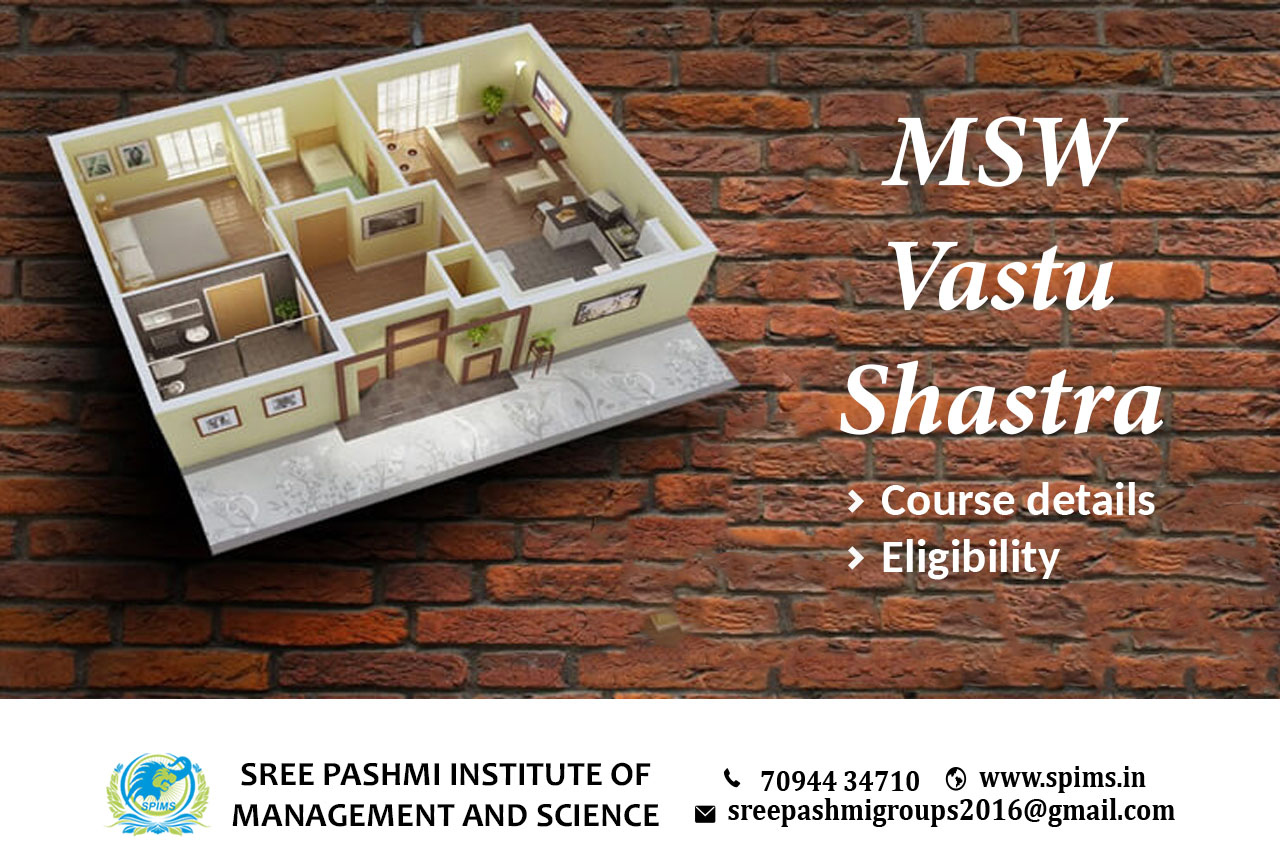 MSW in Vastu Shastra/ MSW in Vastu Shastra course / MSW in Vastu Shastra Degree/ MSW in Vastu Shastra Eligibility/ Scope of MSW in Vastu Shastra/ Salary of MSW in Vastu Shastra / Importance of studying MSW in Vastu Shastra/ Subject involved in MSW in Vastu Shastra course/ Benefits of taking MSW in Vastu Shastra/ MSW in Vastu Shastra in Online Education/ Career opportunities for MSW in Vastu Shastra graduate/MSW in Vastu Shastra distance education. Master of Social Work (MSW) in Vastu Shastra is a postgraduate course that combines the principles of Vastu Shastra with social work practices. The course is designed to provide students with a comprehensive understanding of Vastu Shastra and its application in social work. Vastu Shastra is an ancient Indian science of architecture and design that focuses on creating balance between the physical and metaphysical realms. MSW in Vastu Shastra is a that focuses on the principles and practices of this ancient science. Eligibility - To be eligible for the course, candidates must have a Bachelor's degree in any discipline from a recognized university. Some universities may require candidates to have a minimum percentage of marks in their Bachelor's degree. Here at Sree Pashmi Institute of Management and Science, you can find all types of UG, PG, Diploma, PG Diploma, and certificate programs in distance and online education modes. Enrolling in distance or online education courses via Sree Pashmi Institute of Management and Science, you can get UGC-approved degree certificates along with A+ grade mark sheets from your enrolled University. Also, we provide the students with exclusive online courses, live sessions, and other educational benefits.