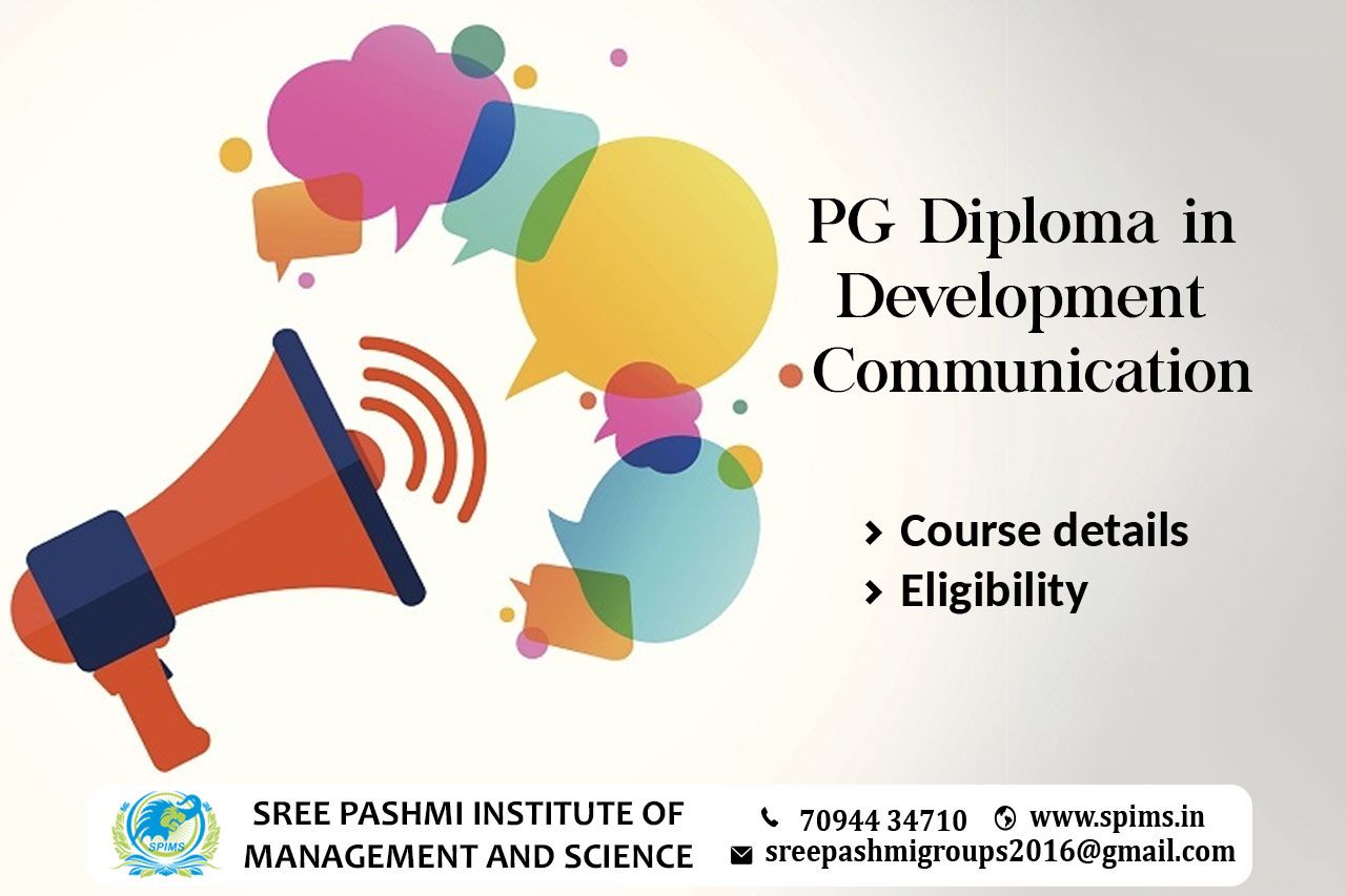 PG Diploma in Development Communication / PG Diploma in Development Communication course /PG Diploma in Development Communication Degree/ PG Diploma in Development Communication Eligibility/ Scope of PG Diploma in Development Communication / Salary of PG Diploma in Development Communication / Importance of studying PG Diploma in Development Communication/ Subject involved in PG Diploma in Development Communication course/ Benefits of taking PG Diploma in Development Communication / E-PG Diploma in Development Communication in Online Education/ Career opportunities for PG Diploma in Development Communication graduate/PG Diploma in Development Communication distance education. A Post Graduate Diploma in Development Communication is a specialized program that focuses on the use of communication strategies and tools to address social and developmental issues, promote social change, and bring about positive impacts in communities. The duration of a PG Diploma in Development Communication course is typically one to two years, depending on the institution and the mode of study. The curriculum of this course may vary depending on the institution and the specific focus areas. Eligibility - The eligibility may vary depending on the institution offering the course. However, a bachelor's degree in any discipline from a recognized university is usually required. Some institutions may also require relevant work experience or a background in social sciences or communication. Sree Pashmi Institute of Management and Science is the leading distance education institution in Coimbatore. At our distance and online admission center, we are dedicated to helping students achieve their academic goals, no matter where they are located or what their circumstances may be. Here we offer all UG, PG, Diploma, PG Diploma, and Certificate programs in both distance and online modes of education.