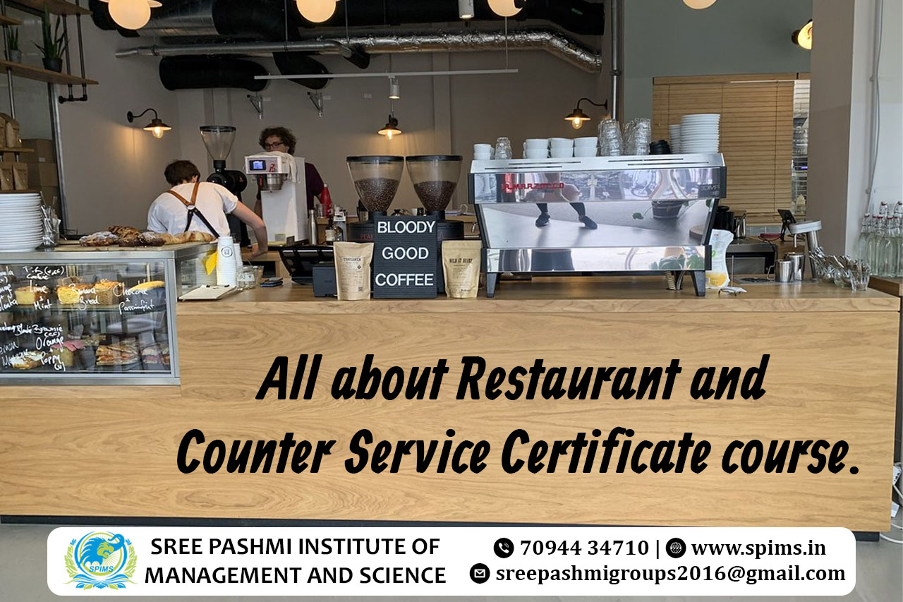 Restaurant and Counter Service Certificate course/ Restaurant and Counter Service course / Restaurant and Counter Service Degree/ Restaurant and Counter Service Eligibility/ Scope of Restaurant and Counter Service Certificate course/ Salary of Restaurant and Counter Service Certificate course / Restaurant and Counter Service Certificate course in top University Coimbatore / Restaurant and Counter Service Certificate course in online education in Coimbatore/ Importance of studying Restaurant and Counter Service Certificate course/ Restaurant and Counter Service Certificate course in top University India/Online Restaurant and Counter Service Certificate course/ Restaurant and Counter Service Certificate course in Online Education/ Career opportunities for Restaurant and Counter Service Certificate course graduate/Restaurant and Counter Service Certificate course distance education / Restaurant and Counter Service Certificate course in top University Tamilnadu Restaurant and Counter Service Certificate course in online education in Tamilnadu/ Subject involved in Restaurant and Counter Service Certificate course/ Benefits of taking Restaurant and Counter Service Certificate course/ Restaurant and Counter Service Certificate course in online education in India. A Restaurant and Counter Service Certificate course is designed to equip individuals with the essential skills and knowledge needed to thrive in the hospitality and food service industry. This certificate program typically covers a range of topics essential for those aspiring to work in restaurants, cafes, fast-food establishments, or counter service settings.The curriculum often includes modules on customer service, food safety and hygiene, menu planning, order processing, cashiering, and effective communication. Students learn about the importance of creating a positive customer experience, handling inquiries and complaints, and ensuring efficient service delivery.Specific areas of focus may include food and beverage operations, restaurant management principles, and the role of counter service in various types of dining establishments. Some programs also provide hands-on training in point-of-sale systems, emphasizing the importance of accuracy and efficiency in processing customer orders. The course may cover hygiene and safety standards, ensuring that students understand the critical aspects of food safety, sanitation, and compliance with health regulations.Upon completion of the Restaurant and Counter Service Certificate course, individuals are prepared for entry-level positions in the food service industry, such as restaurant servers, counter service staff, or cashiers. The practical skills and knowledge gained during the program make graduates valuable assets to establishments seeking professionals capable of delivering high-quality service in a fast-paced environment.Overall, this certificate course serves as a foundational step for individuals seeking to launch a career in the dynamic and diverse field of restaurant and counter service. The practical skills acquired during the program enable graduates to contribute effectively to the success of various food service establishments. Here at Sree Pashmi Institute of Management and Science, you can find all types of UG, PG, Diploma, PG Diploma, and certificate programs in the distance and online education modes. Enrolling in distance or online education courses via Sree Pashmi Institute of Management and Science, you can get UGC-approved degree certificates along with A+ grade mark sheets from your enrolled University. Also, we provide the students with exclusive online courses, live sessions, and other educational benefits.